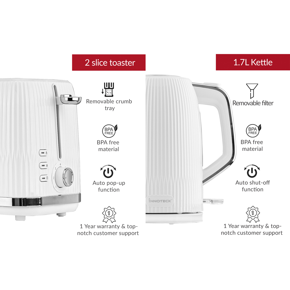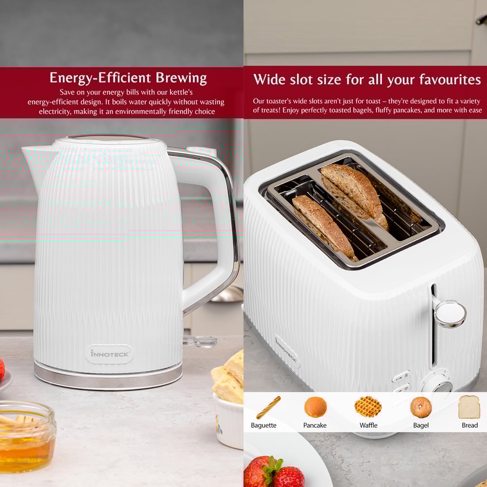 Innoteck Kitchen Pro 1.7L Electric Kettle and Toaster Breakfast Set with Green Ridged Textured and Stainless-Steel Body are designed for a quick and convenient breakfast routine. The toaster is equipped with advanced heating elements for fast and even toasting, ensuring your bread is perfectly golden in no time. The electric cordless kettle boasts rapid boiling capabilities, allowing you to have hot water for your beverages almost instantly.