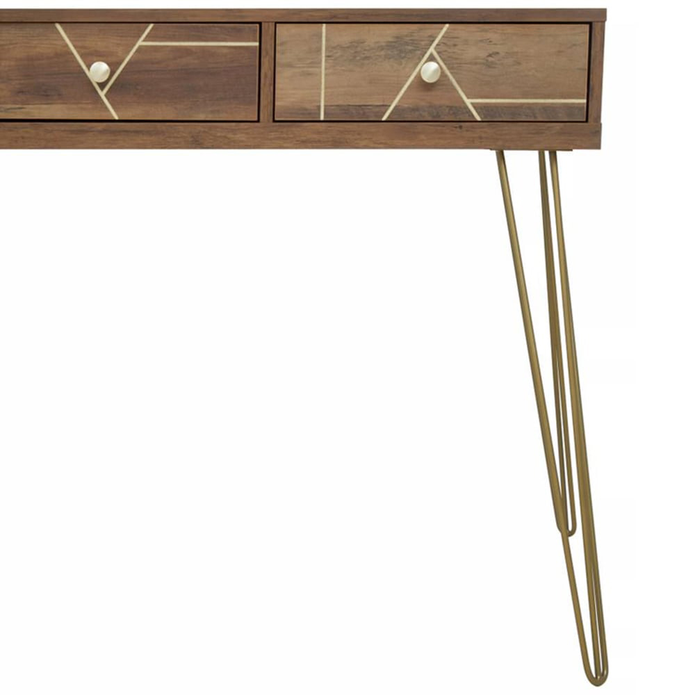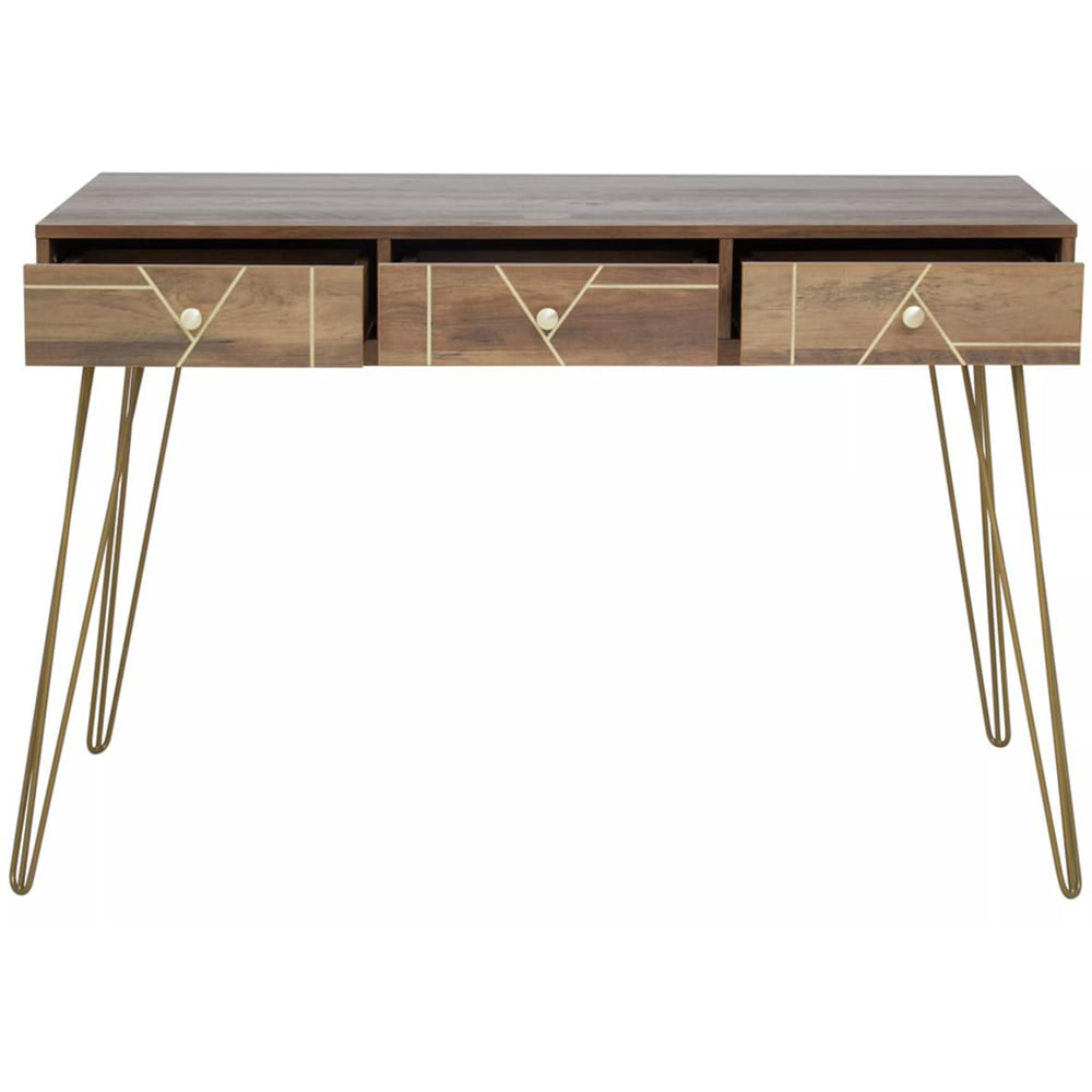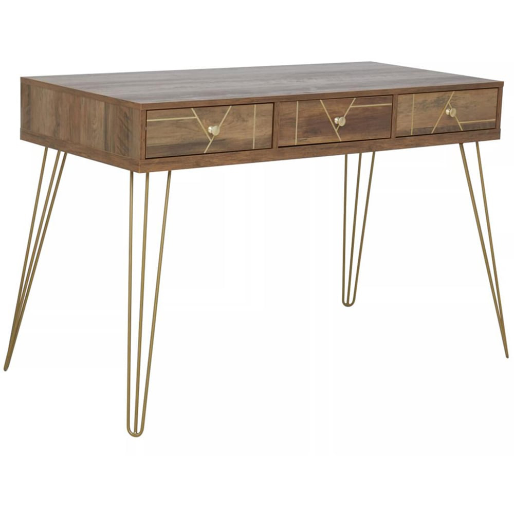 Showcasing a timeless design, this Interiors by Premier Flori Desk lends a classical aesthetic with its wood veneering effect. Designed with both practicality and style in mind, its three drawers with golden knobs and hairpin-styled metal legs in a warm metallic finish elegantly ensure organisation and tidiness. Pretty yet practical, this desk will be a great addition to households or offices.