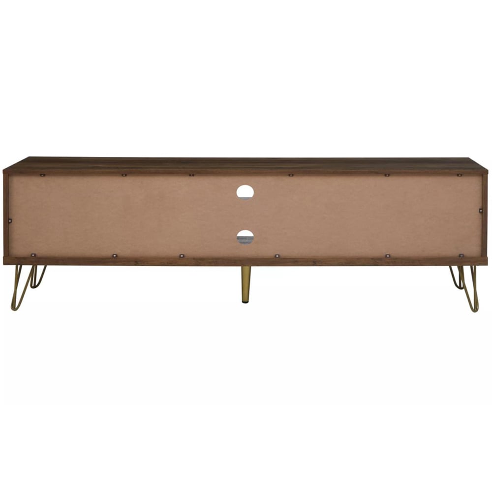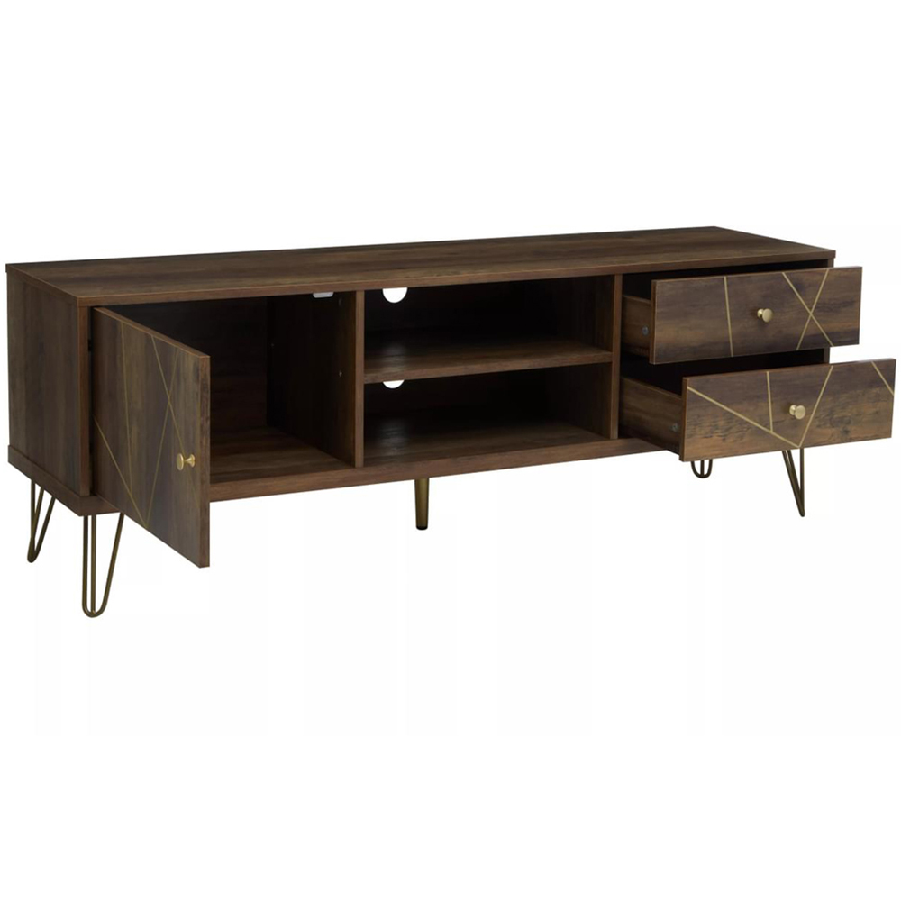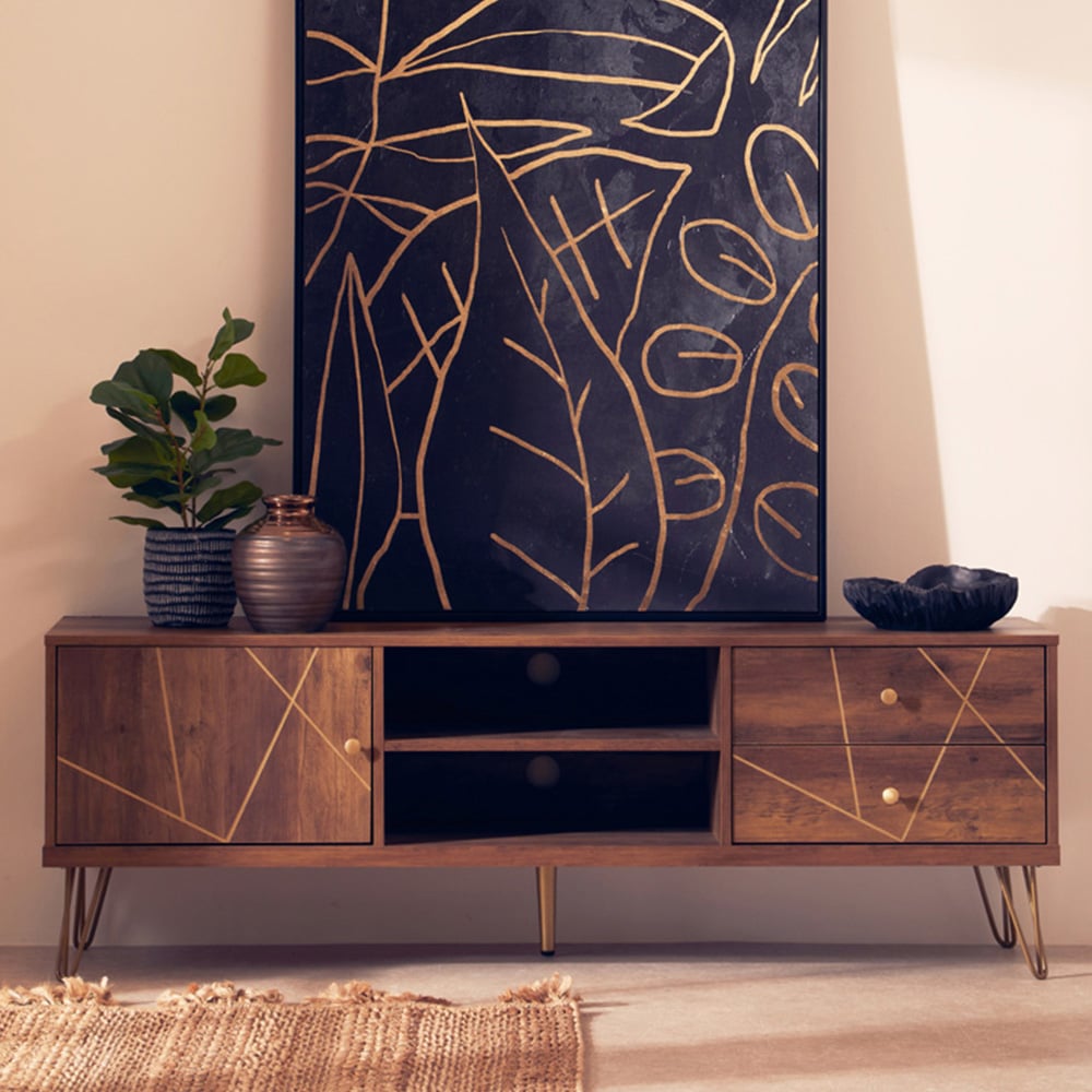 Enhance your living room decor by giving it a mid-century modern feel with this Flori 2 Drawer Wood Veneer TV Unit from Interiors by Premier. Showcasing a timeless design, the TV unit, standing atop sturdy hairpin metal legs in a warm metallic finish, boasts a wood veneering effect. Designed with both practicality and style in mind, it features two shelves, a single-door cabinet and two drawers adorned with golden knobs to complete the look. This unit will be a great addition to your home.
