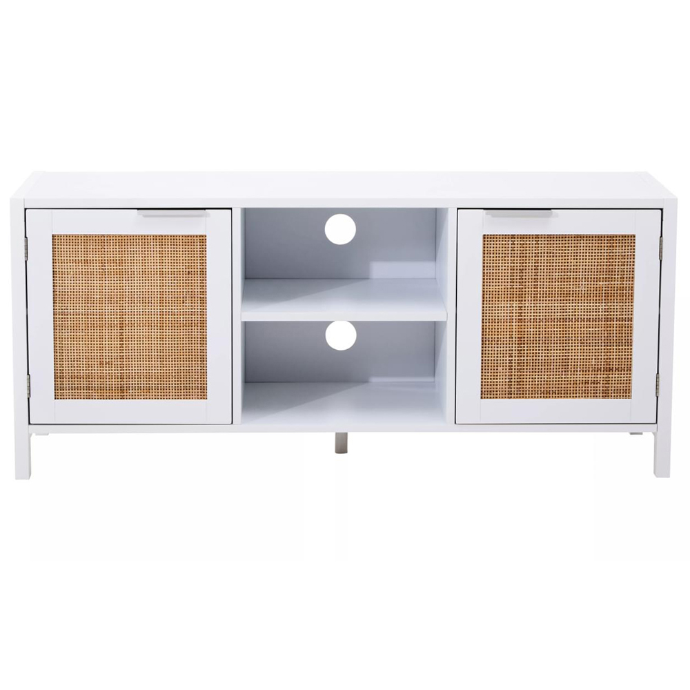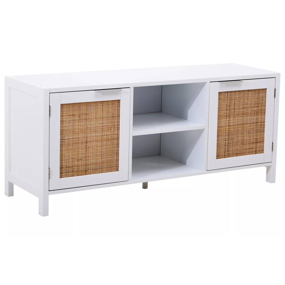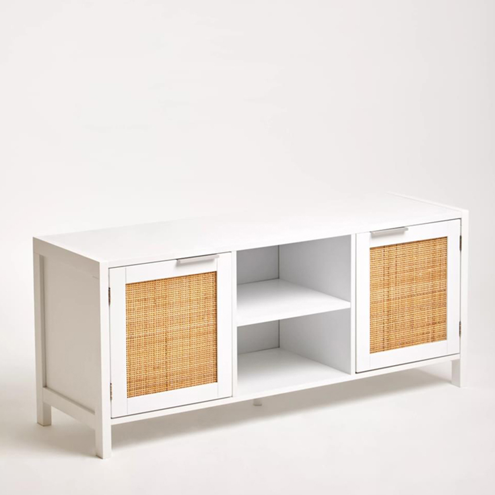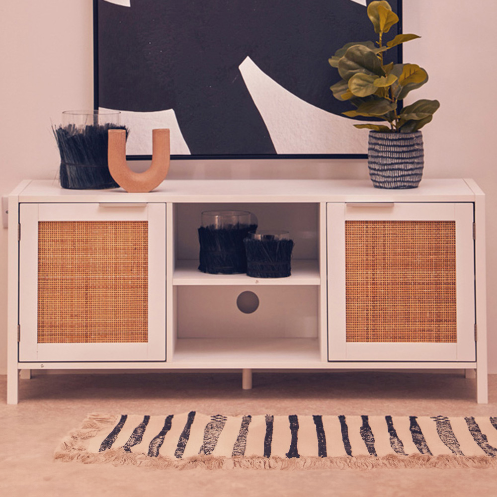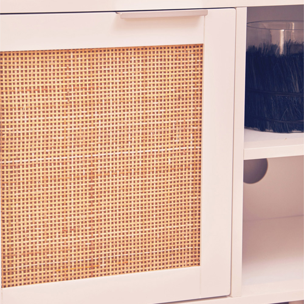 This stylish Sherman Media Unit from Interiors by Premier is crafted from wood with a white paint finish that is perfect to complement a range of decor themes. It features two open shelves and two closed shelves offering ample storage while the natural rattan panels on the doors give the table a warm and earthy aesthetic. Simple yet stylish, the media unit is a perfect piece to create a focal point in a room.