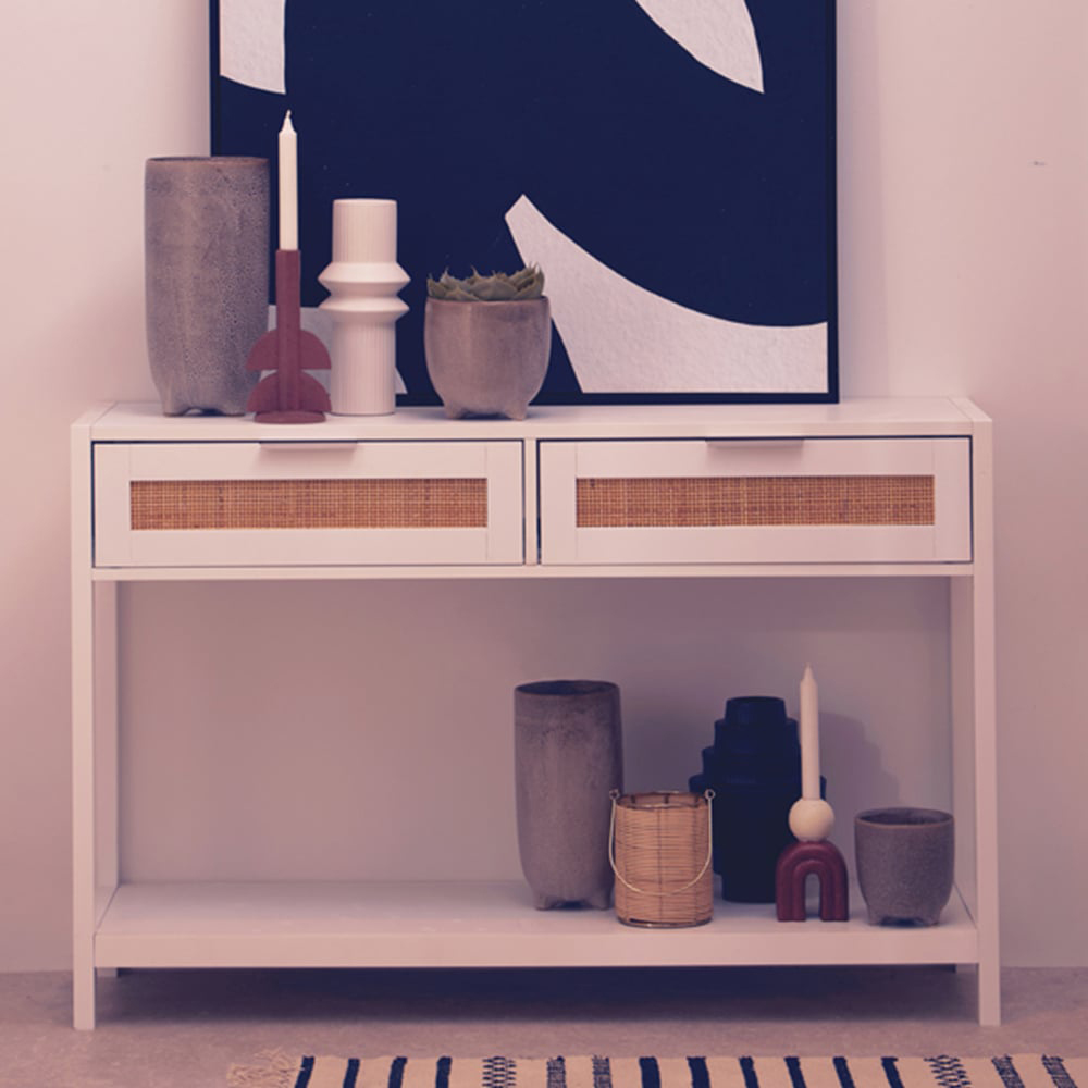 This Sherman Console Table from Interiors by Premier is crafted from wood with a white paint finish that is perfect to complement a range of decor themes. It has natural rattan panels on the front of the two drawers giving it a warm and earthy aesthetic. Complete with an undershelf for additional storage, the table is perfect for adding a stylish yet practical touch to your decor.