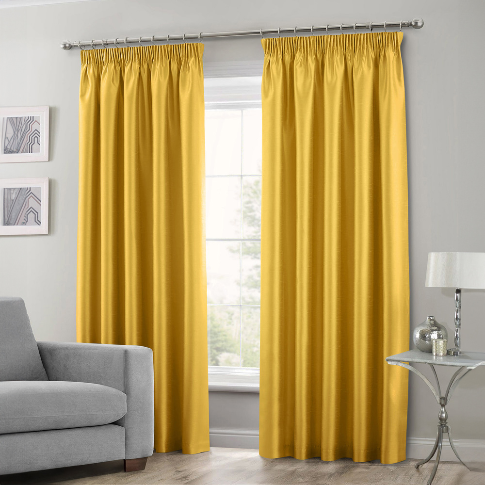 Upgrade your home style and reflect your exquisite taste with the Intimates Faux Silk Ochre Curtains 168 x 189cm. These curtains are suitable for all seasons and can make any room look better. They're made of strong faux silk that won't fade easily. You can also wash them in the machine without much hassle. Plus, you won't need to iron them frequently. The fabric has a nice shine that looks great when light hits it. These curtains feature a cool pencil pleat design and a three-inch tape, making them easy to hang on your curtain pole. They slide smoothly and look elegant when you tie them back. They also come with a lining for extra privacy, warmth, and to keep their shape intact. Add some extra beauty to your home with these extravagant curtains.