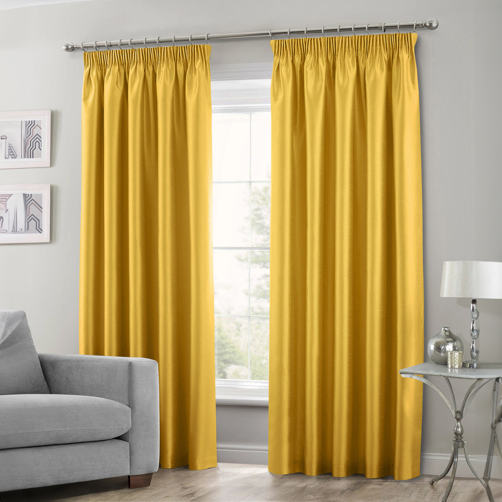 Upgrade your home style and reflect your exquisite taste with the Intimates Faux Silk Ochre Curtains 229 x 189cm. These curtains are suitable for all seasons and can make any room look better. They're made of strong faux silk that won't fade easily. You can also wash them in the machine without much hassle. Plus, you won't need to iron them frequently. The fabric has a nice shine that looks great when light hits it. These curtains feature a cool pencil pleat design and a three-inch tape, making them easy to hang on your curtain pole. They slide smoothly and look elegant when you tie them back. They also come with a lining for extra privacy, warmth, and to keep their shape intact. Add some extra beauty to your home with these extravagant curtains.