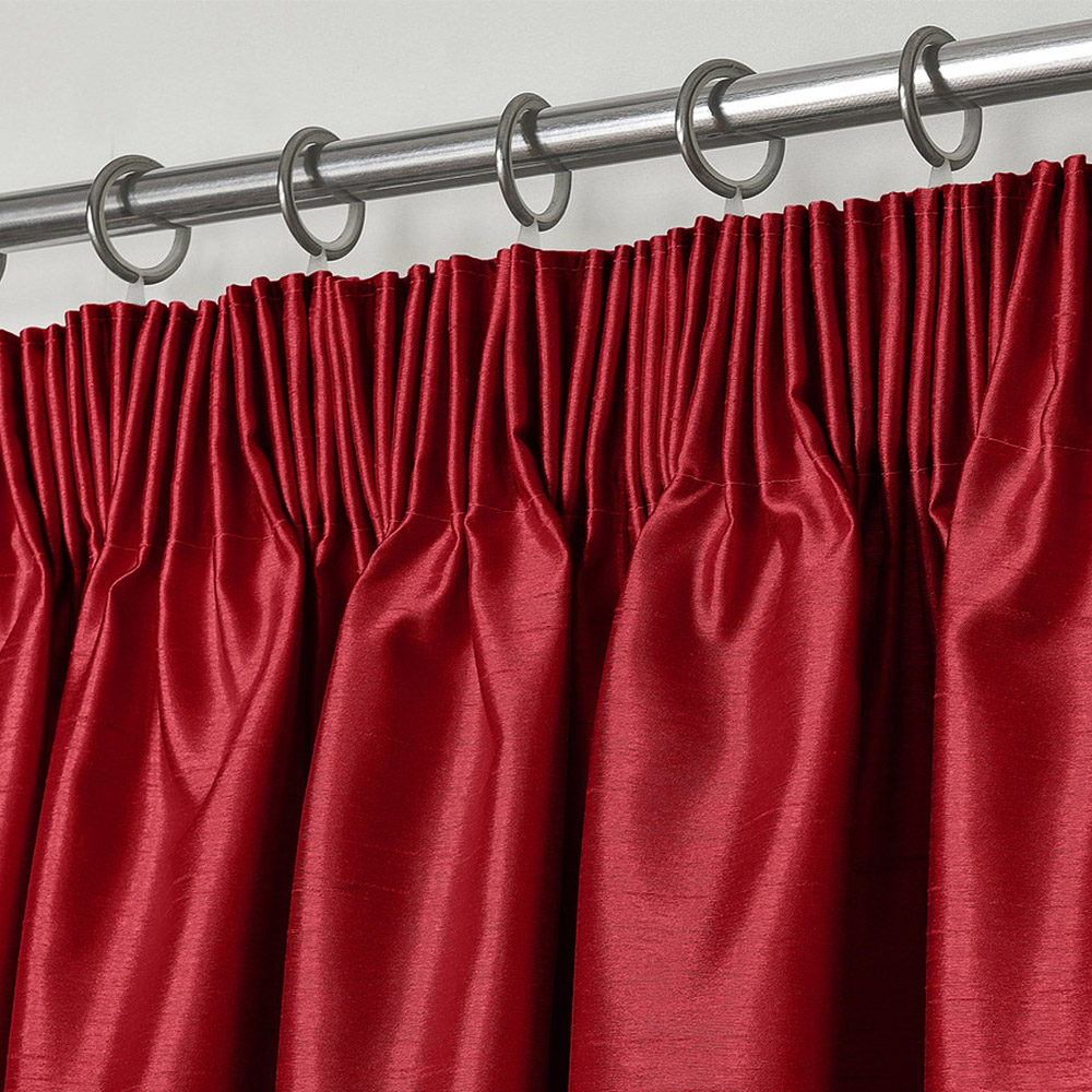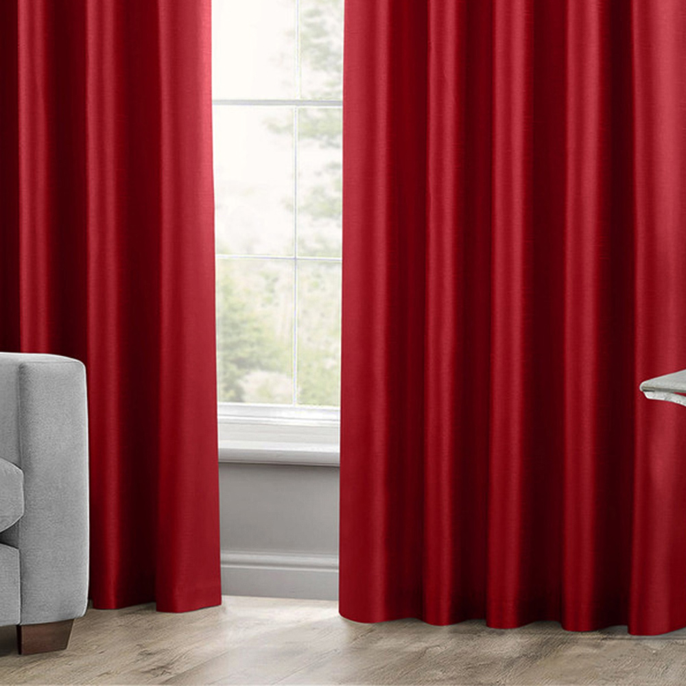 Upgrade your home style and reflect your exquisite taste with the Intimates Faux Silk Red Curtains 168 x 229cm. These curtains are suitable for all seasons and can make any room look better. They're made of strong faux silk that won't fade easily. You can also wash them in the machine without much hassle. Plus, you won't need to iron them frequently. The fabric has a nice shine that looks great when light hits it. These curtains feature a cool pencil pleat design and a three-inch tape, making them easy to hang on your curtain pole. They slide smoothly and look elegant when you tie them back. They also come with a lining for extra privacy, warmth, and to keep their shape intact. Add some extra beauty to your home with these extravagant curtains.