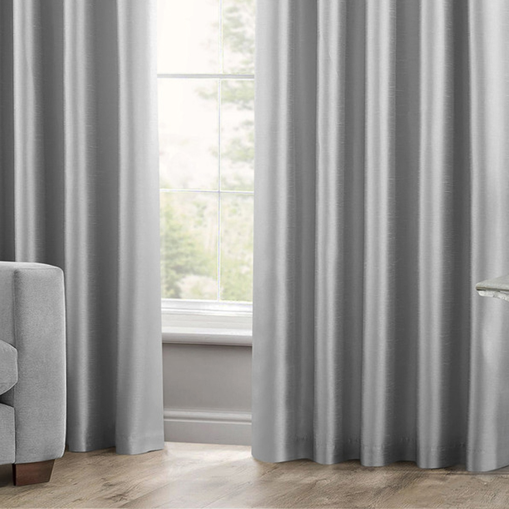 Upgrade your home style and reflect your exquisite taste with the Intimates Faux Silk Silver Curtains 168 x 137cm. These curtains are suitable for all seasons and can make any room look better. They're made of strong faux silk that won't fade easily. You can also wash them in the machine without much hassle. Plus, you won't need to iron them frequently. The fabric has a nice shine that looks great when light hits it. These curtains feature a cool pencil pleat design and a three-inch tape, making them easy to hang on your curtain pole. They slide smoothly and look elegant when you tie them back. They also come with a lining for extra privacy, warmth, and to keep their shape intact. Add some extra beauty to your home with these extravagant curtains.