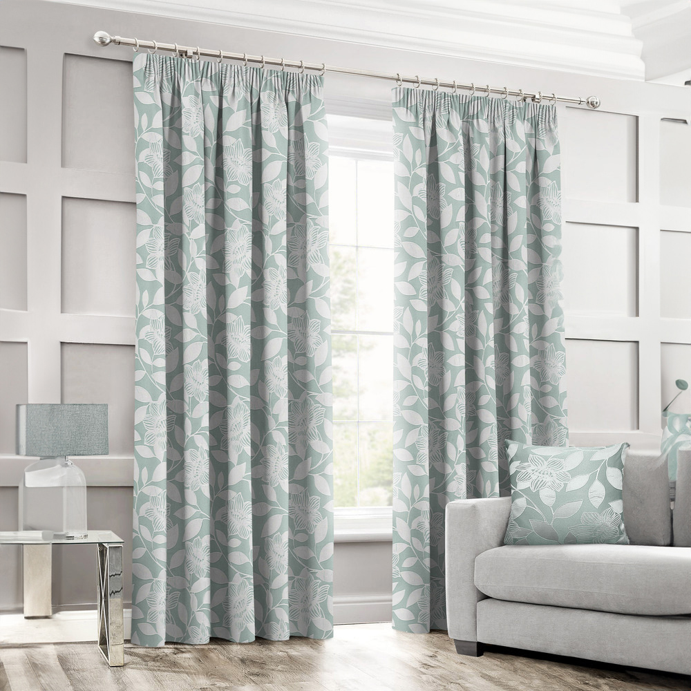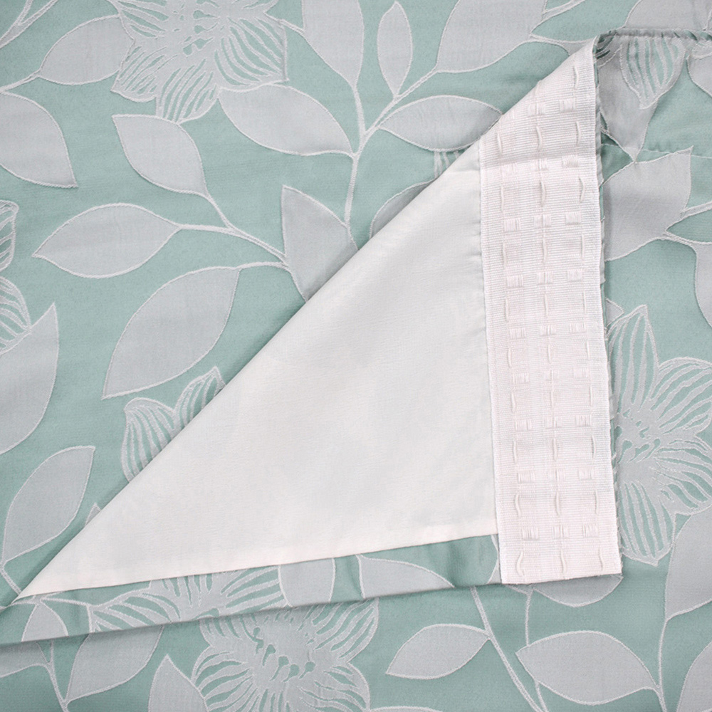 Enhance your space with these Intimates Serena Duck Egg Tape Top Curtains 168 x 223cm. Featuring a modern floral design, these curtains brighten up any room. The detailed stitching around the leaves adds a charming touch to the design. Made from 100% polyester, the fabric is soft, durable, and hangs beautifully. The three-inch tape header ensures easy hanging on any curtain pole or track. Fully lined for added privacy and insulation, these curtains are a practical and stylish addition to any space. These curtains are machine washable for convenient cleaning and require minimal upkeep for easy care.