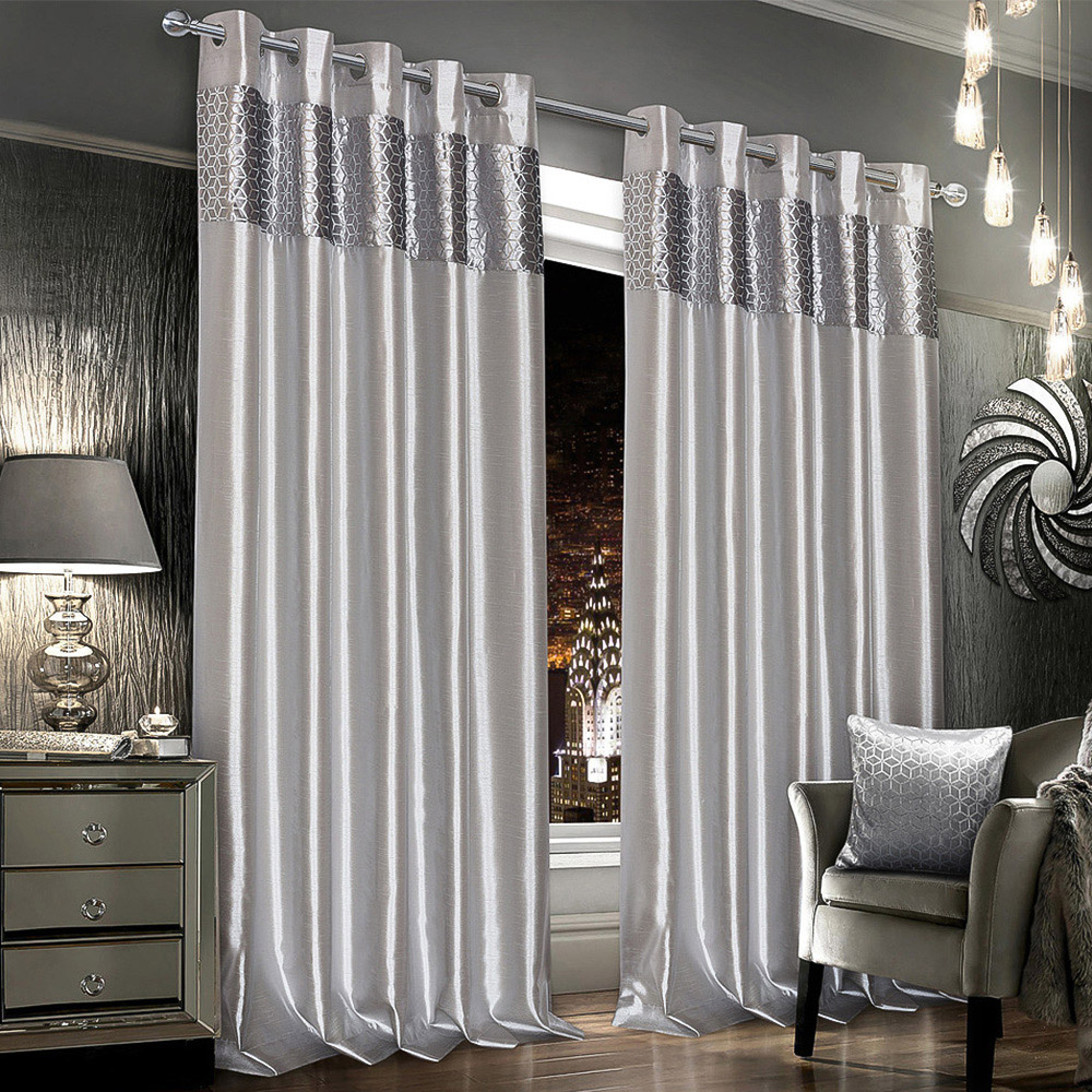 Add a touch of luxury to your home with these Intimates Vera Silver Eyelet Curtains 168 x 183cm. These curtains feature rich colour and a stylish geometric silver foil print on a velvet border, creating a glamorous look for any room. Crafted from high-quality faux silk, they boast a natural shine and are fully lined for a beautiful drape. The eyelet header ensures easy hanging and smooth sliding on the curtain pole. These curtains are machine washable for convenient cleaning and require minimal upkeep for easy care.