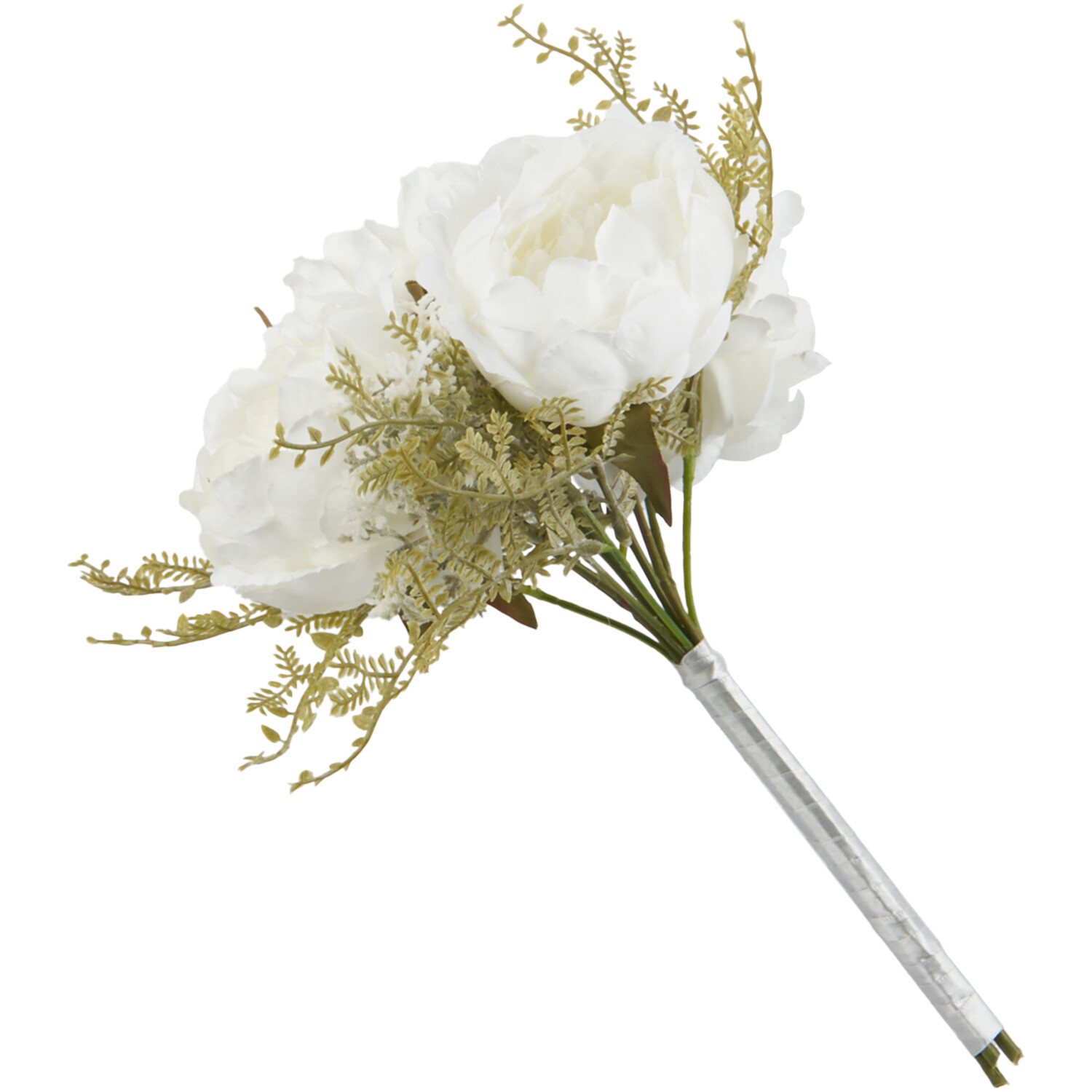 This Ivory Peony Bouquet is a delicate and charming arrangement that combines pops of natural green with dazzling ivory and white for a romantic feel and is finished with white ribbon around the stems. This bouquet is ideal for special occasions such as weddings, anniversary parties, and more or can be used to brighten up your home in a gorgeous vase.