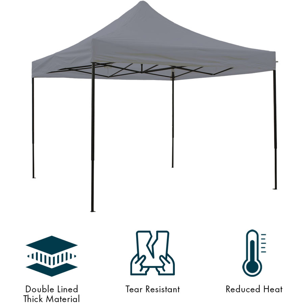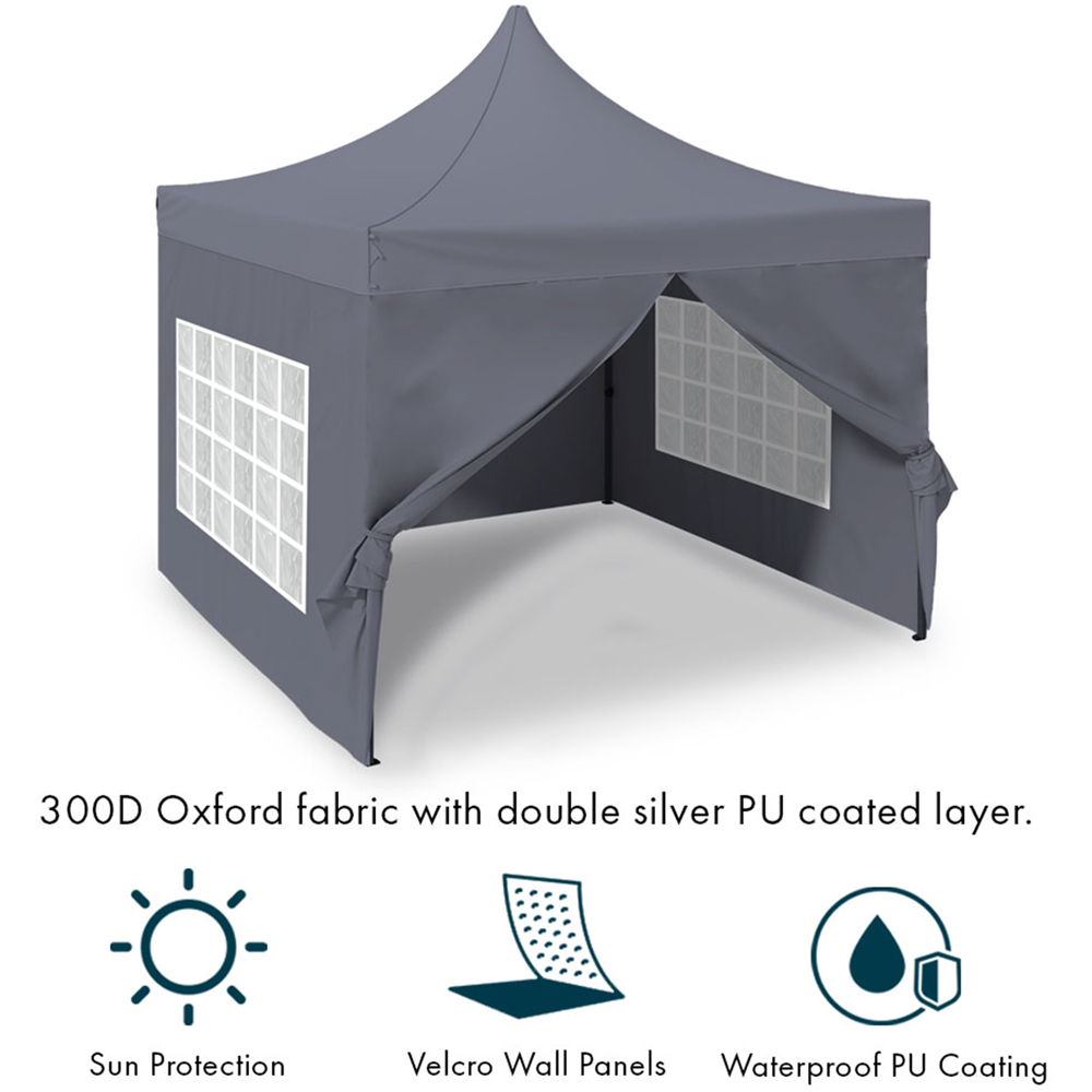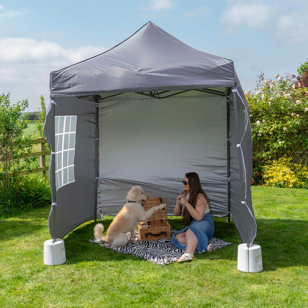 Need a stylish, easy-to-set-up gazebo? This Jack Stonehouse 2.5 x 2.5m Dark Grey Pop Up Gazebo with sides is the perfect blend of practicality and convenience. Designed for effortless setup, you can have it ready in minutes—just walk out the frame with a friend, attach the canopy, extend the legs, and secure it to the ground. The thick 300D double-layered waterproof roof, durable 210D PU-coated side walls, and tear-resistant material ensure long-lasting protection from sun, rain, and wind. Plus, the silver-lined interior keeps things bright and cool inside. Large square windows let in plenty of natural light, while Velcro wall panels make attaching or removing the sides super easy. For added stability, we’ve included bag weights, ropes, and stakes, along with a strong carry bag for easy transport. Note: To keep your gazebo in top condition, avoid leaving it unattended, overnight, or in extreme weather conditions.