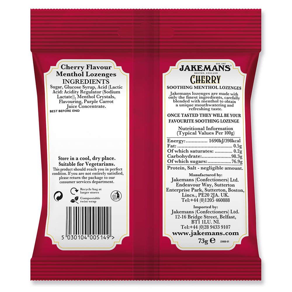 Keep sore throats soothed with Jakeman Cherry Soothing Menthol Lozenges. Delicious tasting - these menthol lozenges are made with only the finest ingredients. It contains no artificial colours or flavours and is suitable for vegetarians.