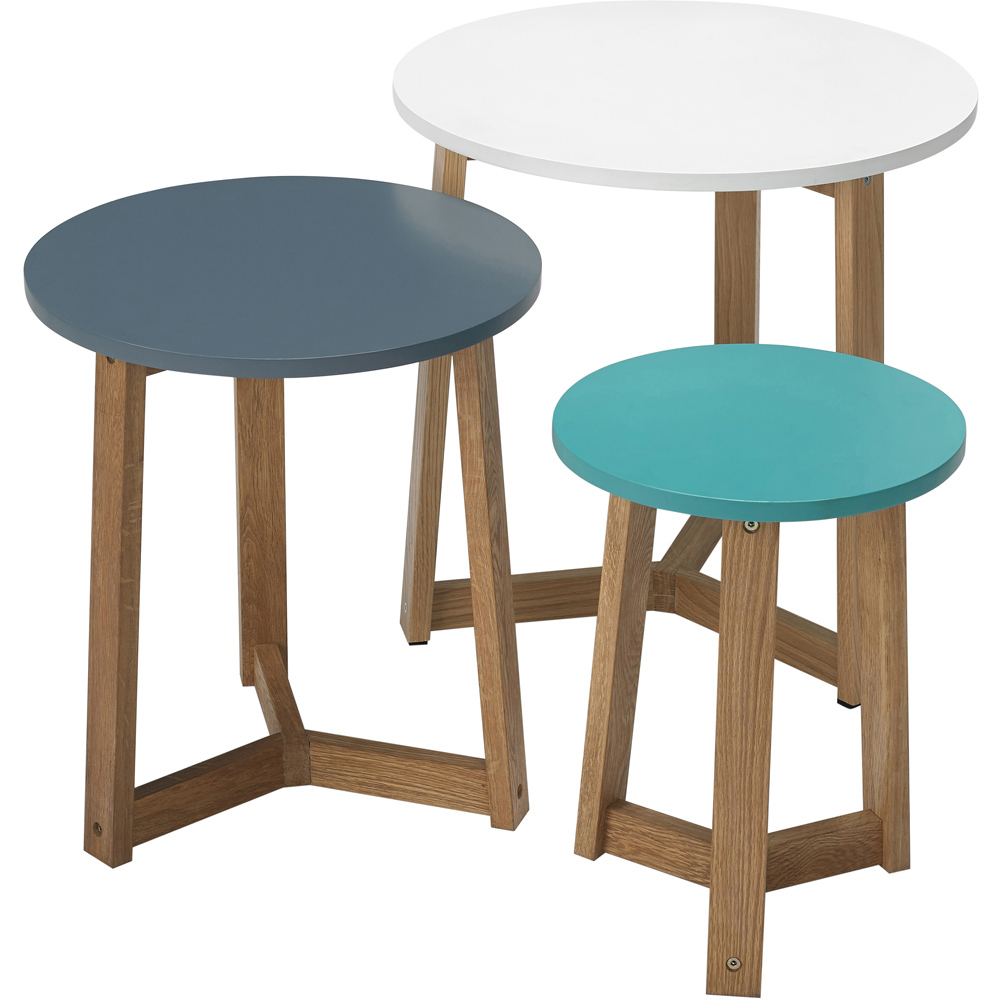 Bring home the centrepiece that sparks conversation with this LPD Furniture Jasper 3 Piece Solid Oak Nest Tables. It offers a timeless look with an oak effect base yet a modern feel with the three different coloured tables.