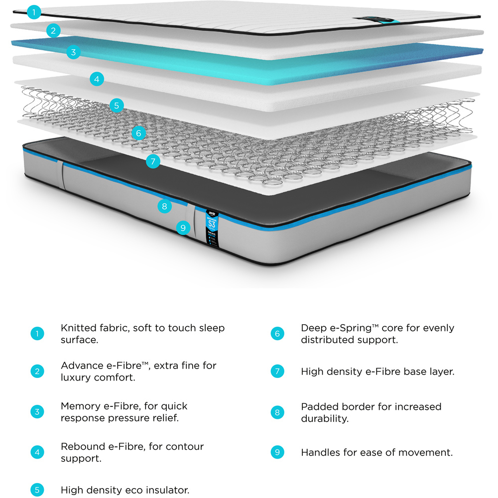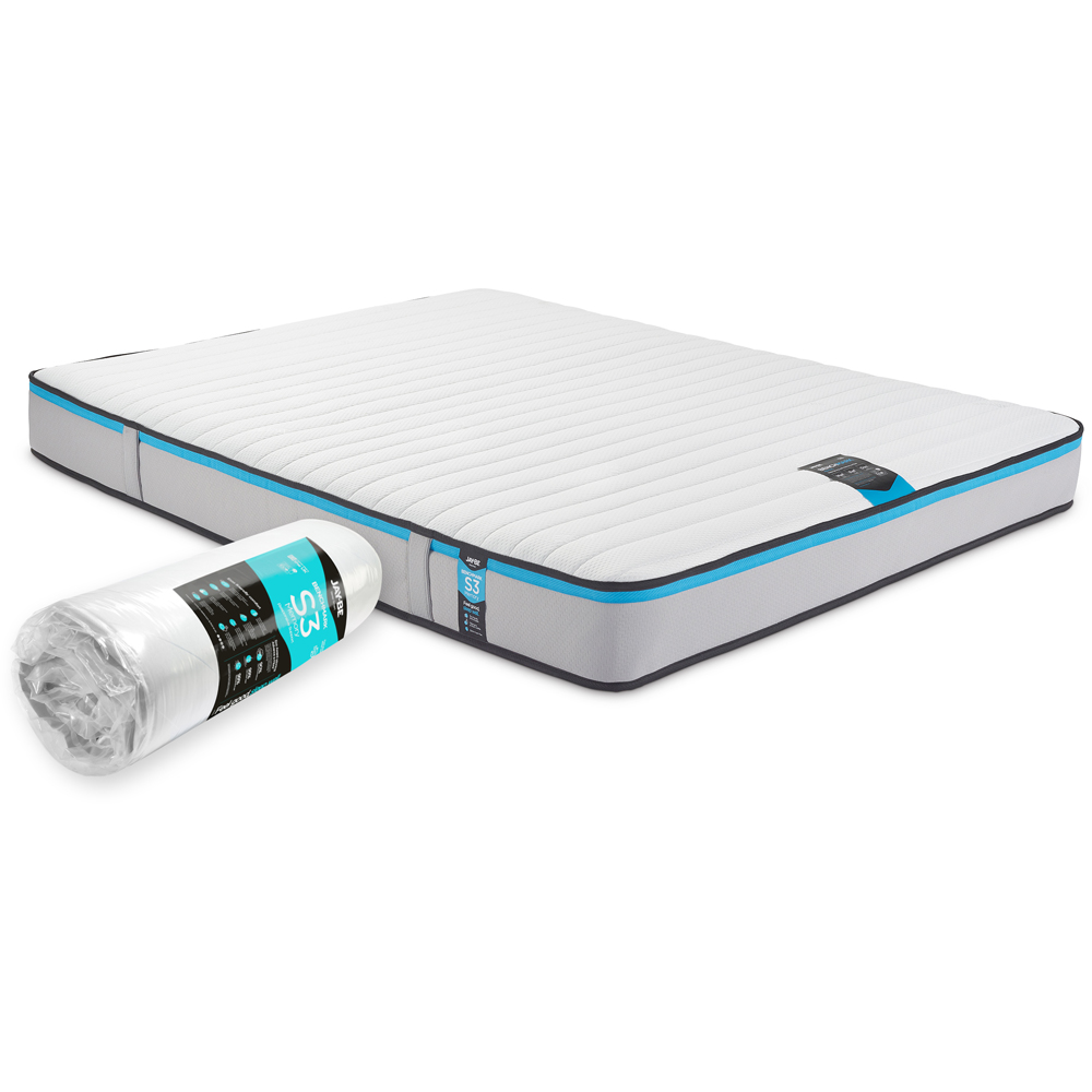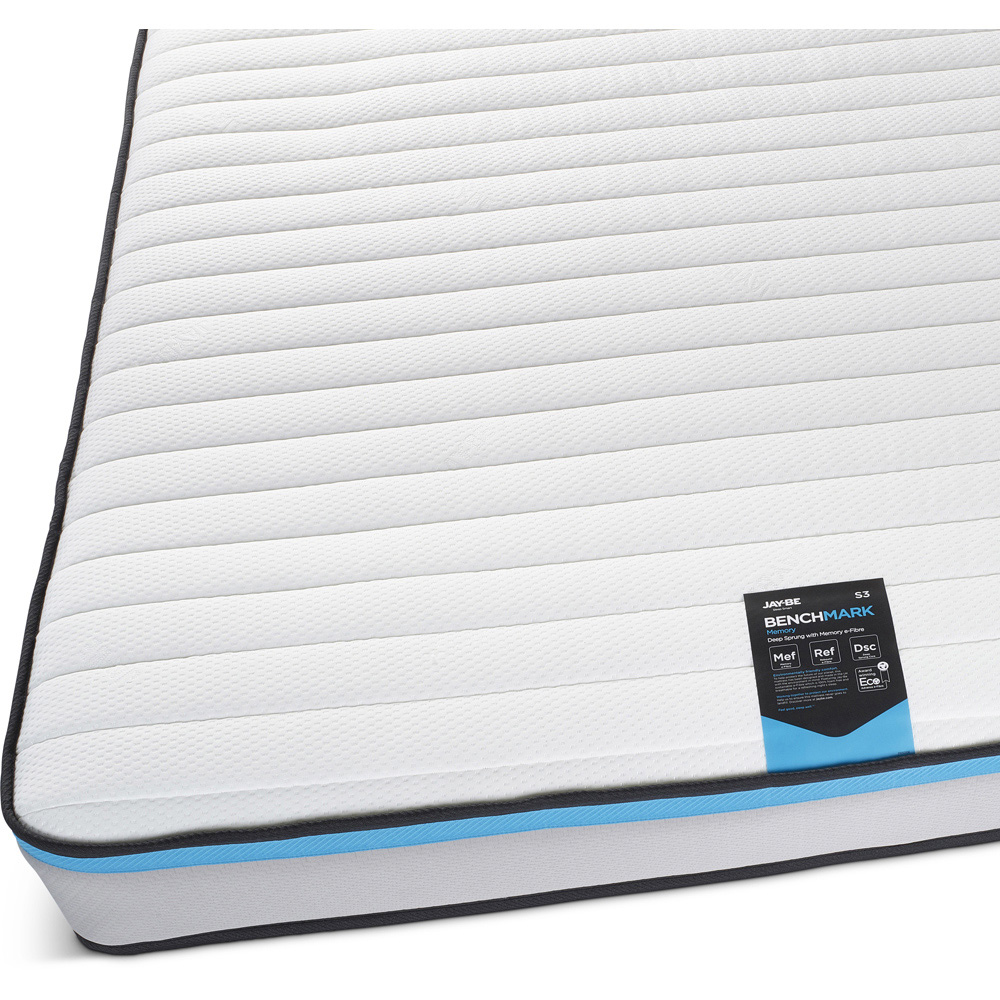 Indulge in plush comfort with this Jay-Be Benchmark S3 King Size Memory Eco-Friendly Mattress. This mattress features a memory e-fibre, an environmentally friendly alternative to memory foam, offering pressure-relieving support throughout the night. Ensuring comfortable sleep, its deep e-Spring core is topped with a supportive cushioning layer of rebound e-fibre and super soft advanced e-fibre for improved moisture and temperature regulation. Made in the UK and designed with the environment in mind, this mattress is foam-free and 90% free from CO2 emissions. Plus, it comes with a five-year guarantee for added peace of mind. The e-fibre comfort layers used in the mattresses are made from 100% recyclable plastic bottles, diverting over 70 million from going into landfills or oceans. Made in the UK to British and European safety standards.