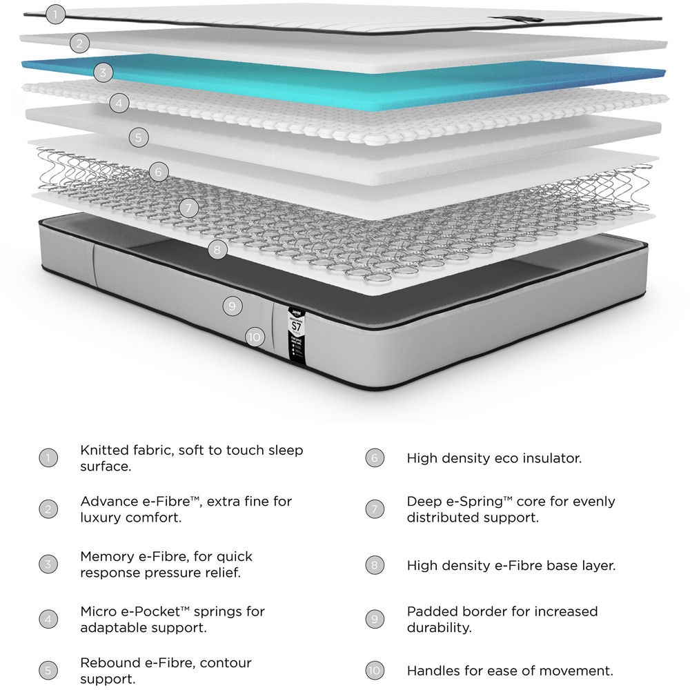 Elevate your sleep experience with this Jay-Be Benchmark S7 King Size Tri-brid Eco-Friendly Mattress. Perfect for the ultimate night's sleep, this mattress features a deep e-spring core topped with micro e-pocket springs, memory e-fibre and extra fine Advance e-fibre. The unique combination of these premium comfort layers works together to deliver ultimate pressure-relieving adaptive body support. Also, the breathable layers reduce moisture for comfortable sleeping. Made in the UK and designed with the environment in mind, this mattress is foam-free and free from 90% CO2 emissions. Plus, the sonic welded fabric pockets remove the need for glue, making them easier to recycle at the end of life. The mattress comes with a five-year guarantee for added peace of mind. Made in the UK to British and European safety standards.