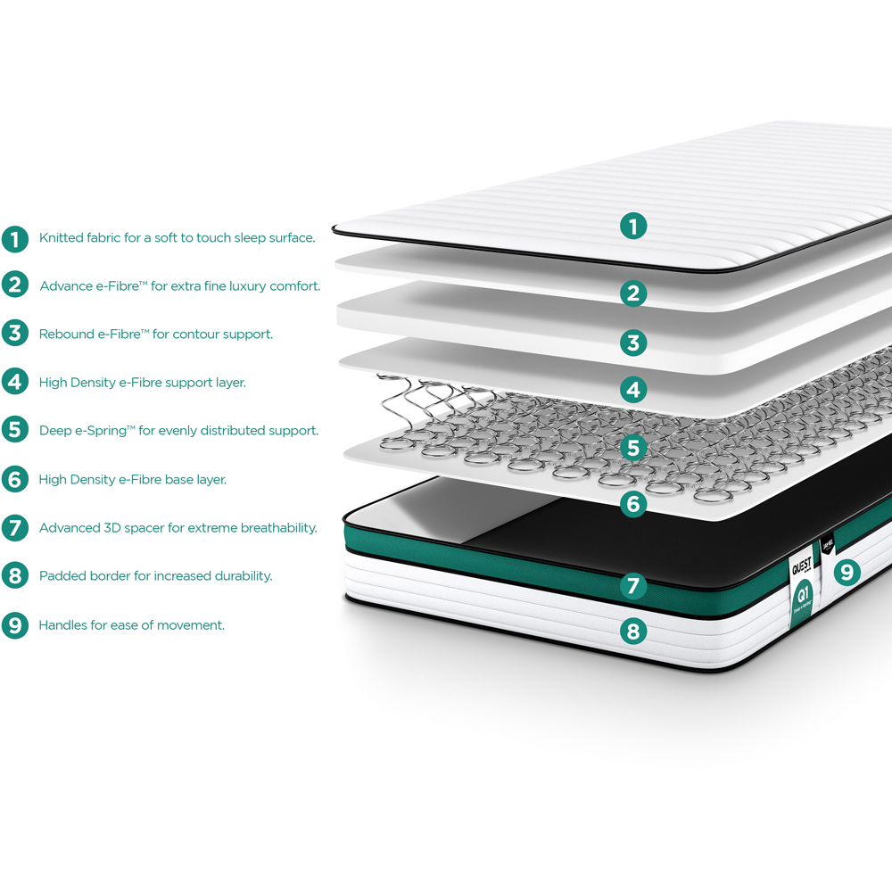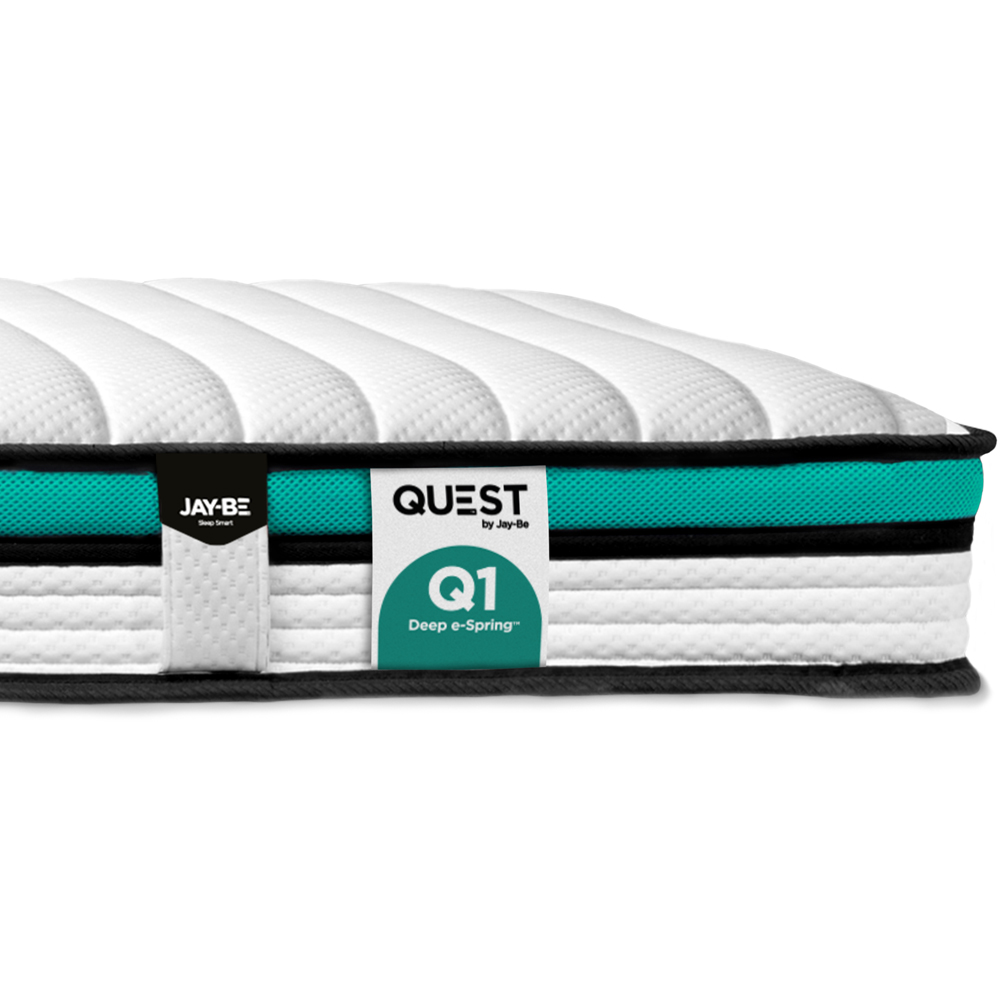 Sink into comfort with this Jay-Be QUEST Q1 e-Sprung Eco-Friendly Children's Mattress. This deep e-spring core mattress ensures body support for growing bones and muscles. Finished in a soft, knitted fabric, this mattress boasts an advanced e-fibre for luxury comfort and a rebound e-fibre for contour support. Also, offering maximum comfort, the high-density base layer and 3D spacer provide extreme breathability. Plus, the mattress comes with a five-year guarantee for added peace of mind.