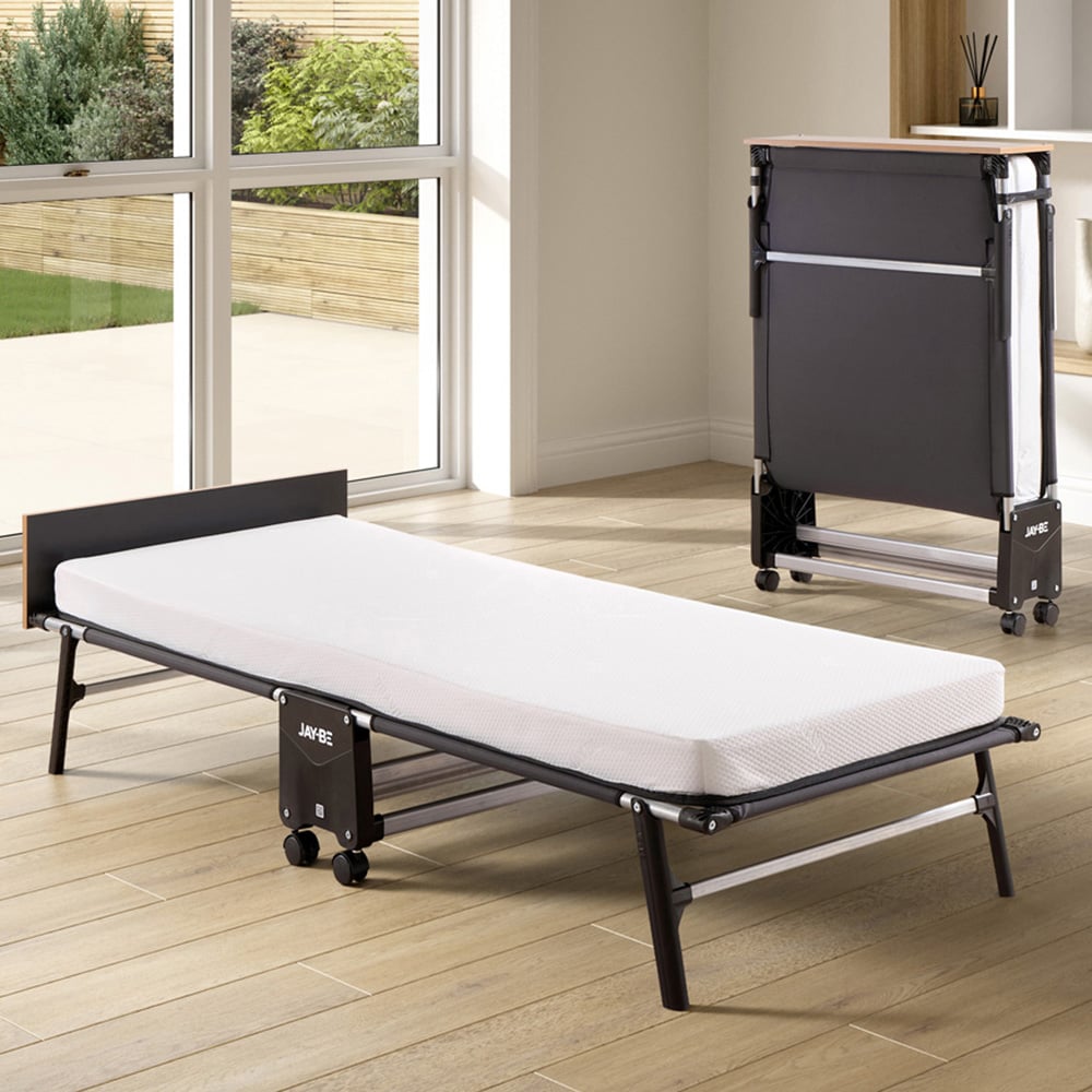 Prepare to elevate the comfort in your rooms with the Jay-Be RM80 Single Rollaway Folding Bed with Memory Mattress. This folding bed offers comfort and space-saving convenience with a modern design. Its 360-degree locking castors ensure easy mobility and work with the J-grip anti-tip legs to provide stability. The durable Mono-Tex platform base combines the memory e-Fibre mattress and a headboard for resting your pillow, ensuring comfort throughout the night. This made-in-UK bed is perfect for guests, sleepovers, and glamping and exceeds internationally recognized safety and quality standards.