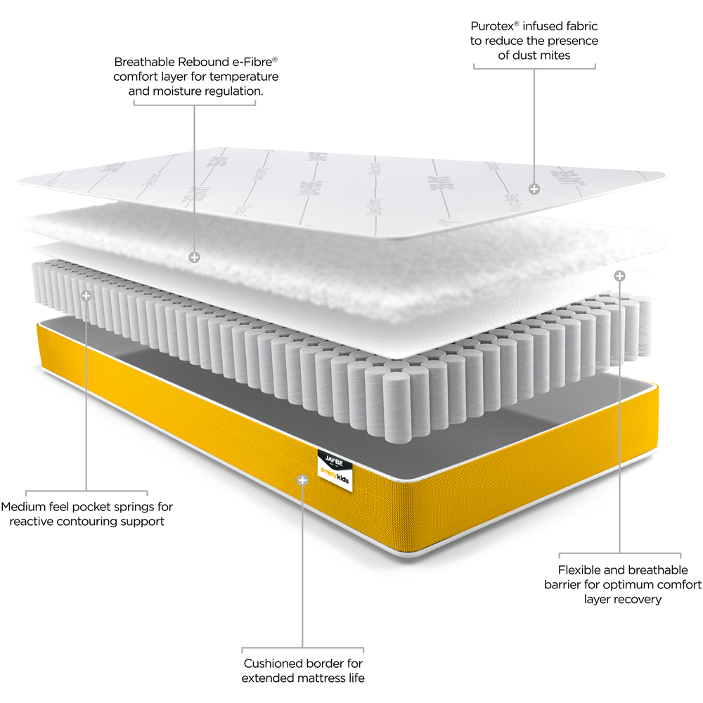 Indulge in ultimate comfort with this Jay-Be Simply Kids Single Anti-Allergy e-Pocket Mattress. This mattress features a higher specification deep e-pocket spring interior that responds to the contours of your child's body. It comes with the latest Purotex anti-allergy technology that actively creates a cleaner and healthier sleeping environment to ensure a peaceful night's sleep. Also, this is a 100% natural pro-biotic remedy which absorbs moisture and lowers the presence of dust mites and other allergens. Also, with an eco-friendly design, this mattress is 100% foam-free and free from harmful VOC emissions. For added comfort, it comes with a breathable rebound e-fibre for temperature and moisture regulation. To ensure long-term use, simply rotate regularly to maximise the life of the mattress. Plus, it comes with a five-year guarantee to ensure complete peace of mind. Made in the UK to British and European safety standards.