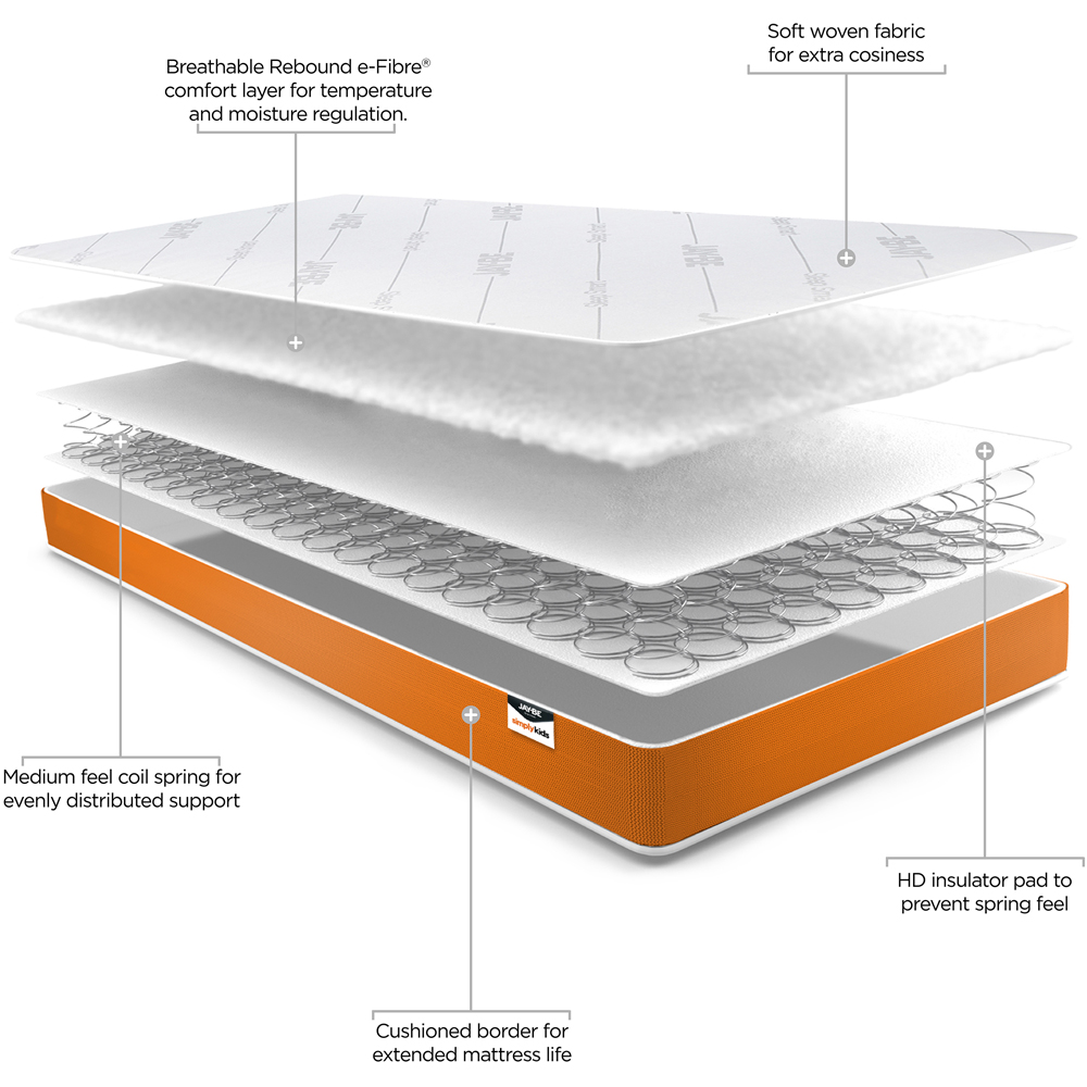 Sink in comfort with this Jay-Be Simply Kids Single Foam Free Sprung Mattress. Designed with the environment and your children's future in mind, this mattress is hypoallergenic and made using a medium firmness spring to distribute weight and offer support for growing bones and muscles. For added comfort, it is topped with a high-density eco-insulator and a cushion of rebound e-fibre for extra support and cosiness. Also, with an eco-friendly design, this mattress is 100% foam-free and free from harmful VOC emissions. To ensure long-term comfort, simply rotate regularly to maximise the life of the mattress. Plus, it comes with a five-year guarantee to ensure complete peace of mind. Made in the UK to British and European safety standards.