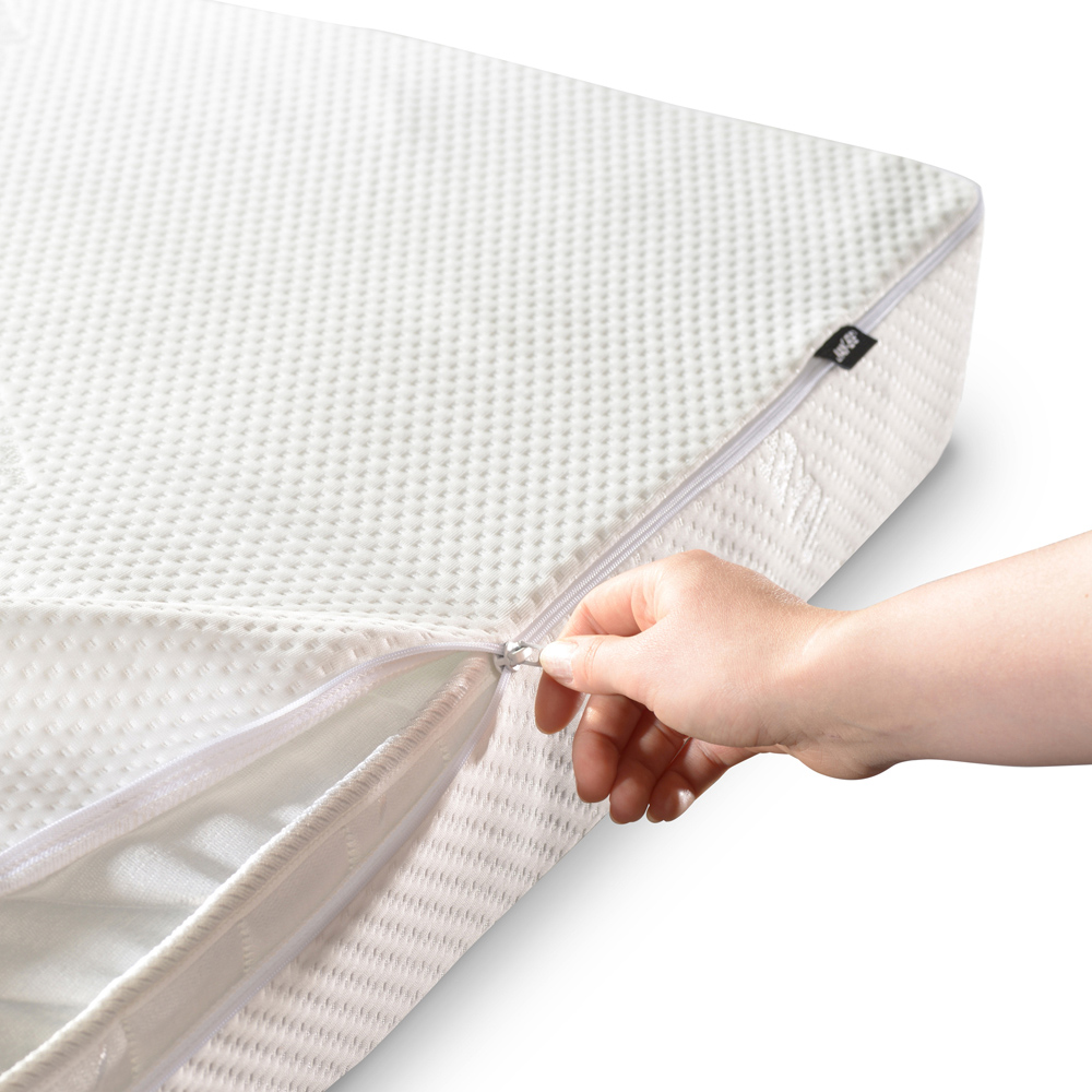 Extend the lifespan of your mattress with the Jay-Be Single Hideaway Folding Bed Waterproof Mattress Protector. This washable mattress protector is tailored to perfectly fit your Jay-Be Folding Bed mattress. It features an easy zip-on design and is made from hypoallergenic materials. Additionally, this protector creates an effective barrier against dust mites and allergens.