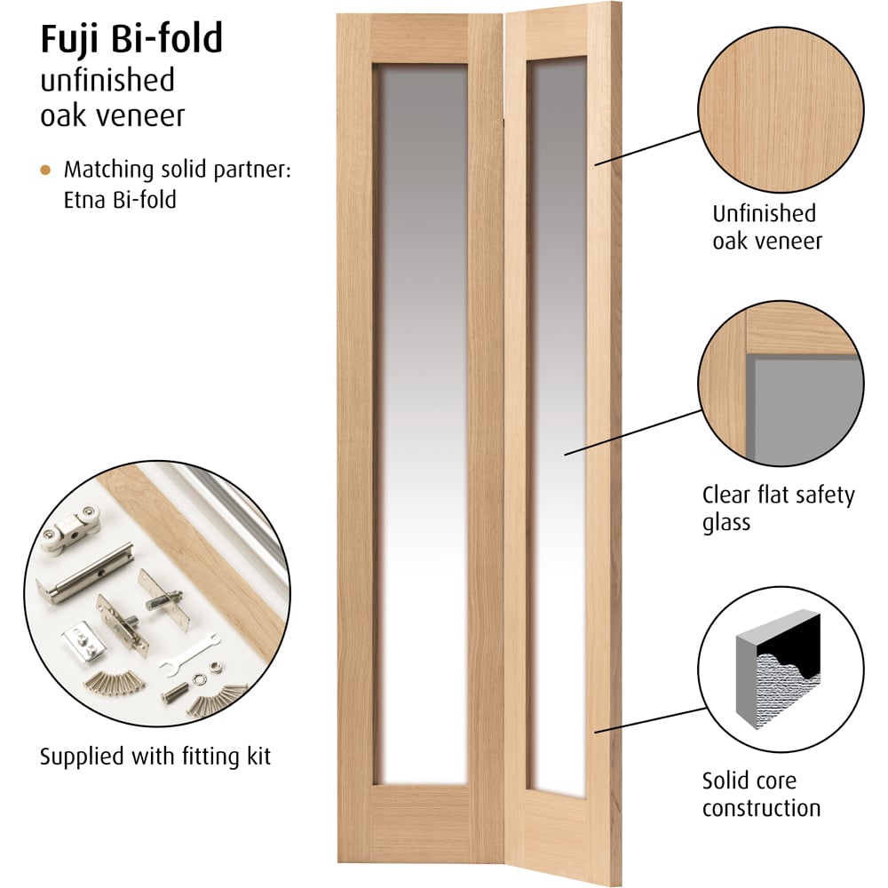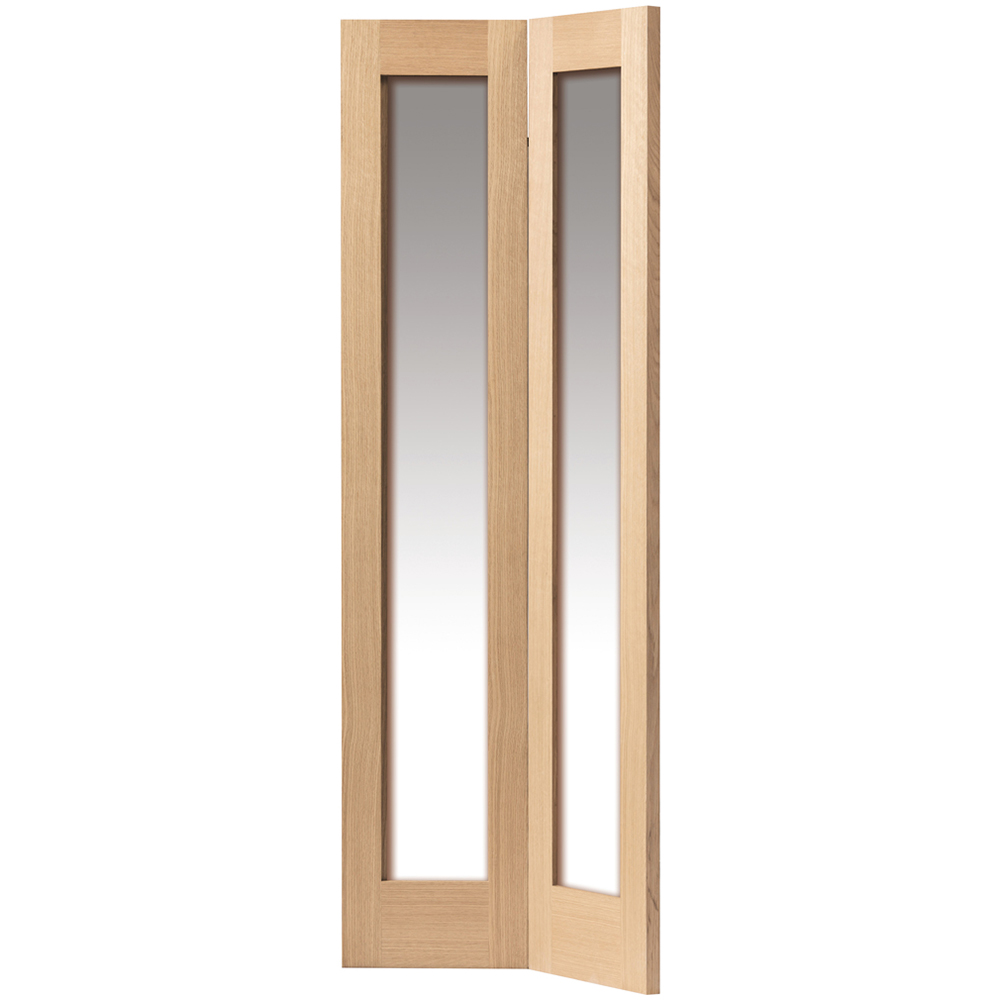 Enhance your interiors with the JB Kind Fuji Shaker Oak Glazed Bi-Fold Internal Door 1981 x 762mm. This door features a large, clear, glazed shaker-style panels, offering a stylish and modern addition to any home. It is supplied with a varnish finish, showcasing a beautiful oak veneer finish. The door's solid core construction ensures durability and a premium feel, making it an excellent choice for those looking to add a contemporary touch to their interior. Additionally, the door comes with fitting accessories and instructions for easy installation.