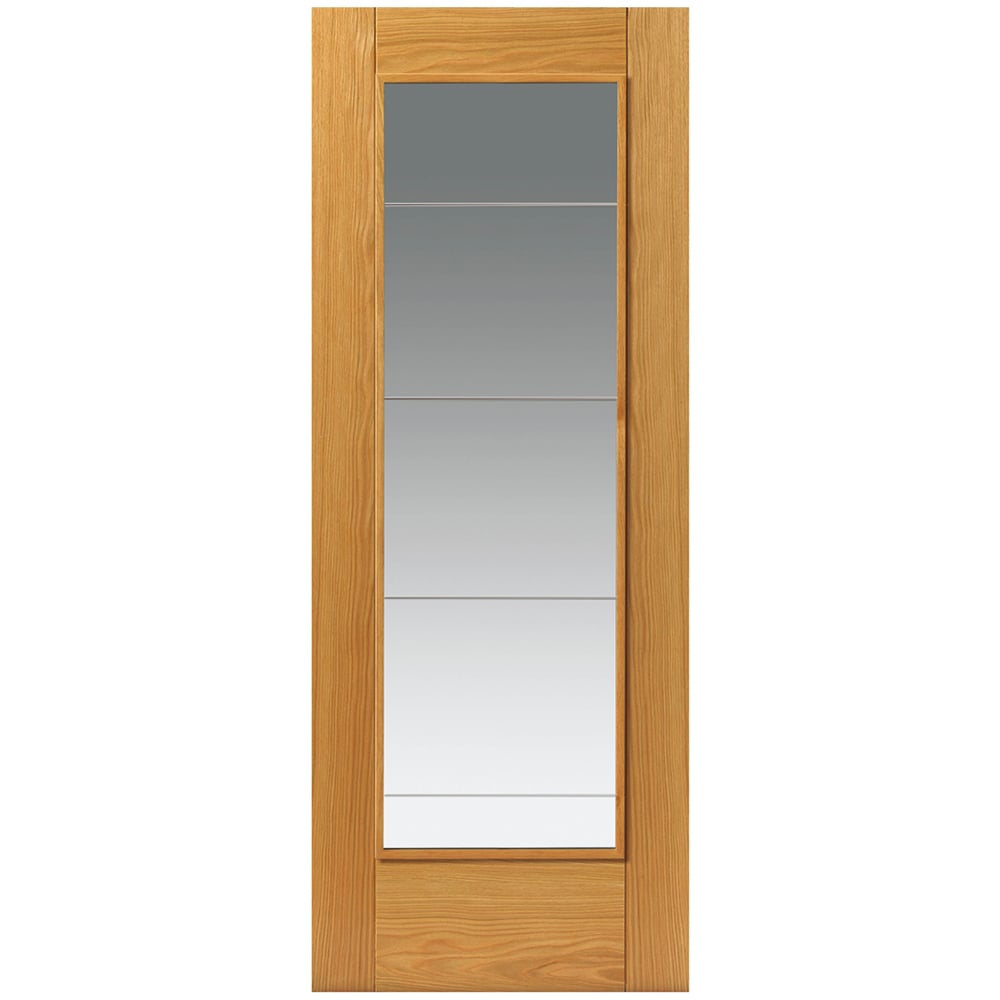 Enhance your interiors with JB Kind Medina Contemporary Oak Glazed Veneered Internal Door 1981 x 838 x 35mm. The popular contemporary oak veneered internal door, glazed with clear diamond-cut glass, is a stylish and modern choice for any home. Supplied complete with a varnish finish, this door showcases a beautiful oak veneer finish. It features five ladder-style panels with elegant etching on the glass, adding a unique design element. With its solid core construction, it provides both durability and a premium feel, making it an excellent choice for enhancing your interior with a touch of contemporary elegance. It comes complete with a door handle and hinges, making installation a breeze.