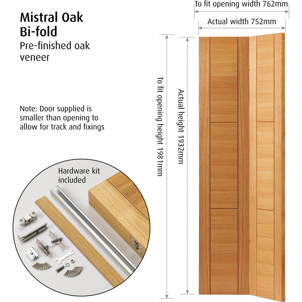 Enhance your interiors with JB Kind Mistral Contemporary Oak Bi-Fold Internal Door 1981 x 762 x 35mm. It features a grooved panel effect and is a stylish and modern addition to any home. Supplied complete with a varnish finish, this door showcases a beautiful oak veneer finish. It has three ladder-style panels grooved into MDF, adding a unique design element. With its solid core construction, it provides both durability and a premium feel, making it an excellent choice for those looking to enhance their interior with a contemporary touch.