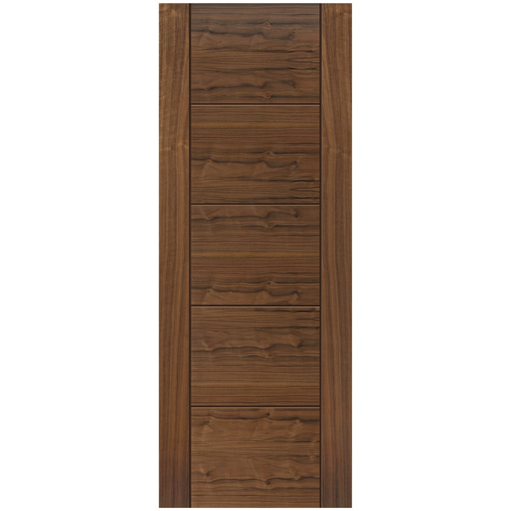 Unleash the charm of your interiors with the JB Kind Tigris Contemporary Walnut Internal Door 1981 x 610mm. This pre-finished door features a beautiful walnut veneer finish, which gives it a rich, natural look that enhances any interior. It comes with a varnish finish that adds shine and protects the surface. The door has a grooved panel effect with five ladder-style panels, each with real wood grooves for added texture and style. The solid core construction ensures durability and provides good sound insulation. It is easy to open and close with door handles and hinges. Plus, the door is suitable for a pocket door system and offers fire resistance for up to 30 minutes, providing added safety for your home.
