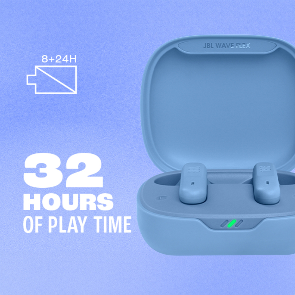 Take your favourite music wherever you go with JBL Wave Flex Blue In-Ear Wireless Earbuds. This secure, reliable device offers you the most from your mixes with high-quality audio. With up to 32 hours of total battery life, eight hours of battery life in the earbuds and 24 in the case, it provides all-day audio. It is designed for daily entertainment with a comfortable, ergonomic, stick-closed design and splash and dust-resistant features. No matter how noisy the place is, your hands-free stereo calls will always be crystal clear. The Voice Aware lets you balance how much of your own voice you hear while talking with others. The Smart Ambient technology keeps you aware of your surroundings while you keep the music playing. You can speed charge two additional hours of power in just 10 minutes when you need an extra boost. The IP54-certified earbuds and IPX2 charging case are water and dust-resistant for all-day experiences.