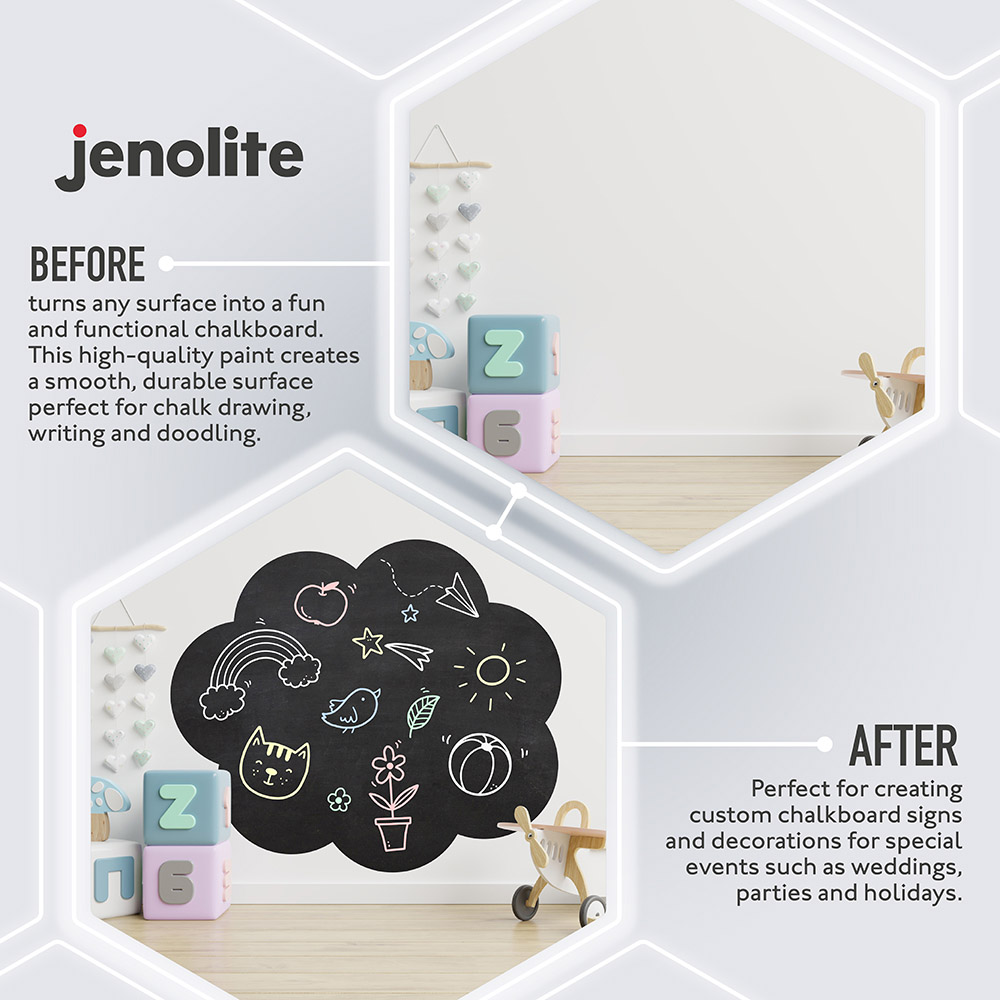 Turn any surface into a fun and functional chalkboard with this Jenolite Original Black Chalkboard Paint. This 500ml high-quality paint creates a smooth, durable surface perfect for chalk drawing, writing and doodling. Whether you want to create or simply rejuvenate a chalkboard wall in your home, office or classroom, this paint makes it easy and affordable. It is perfect for creating custom chalkboard signs and decorations for special events such as weddings, parties and holidays.