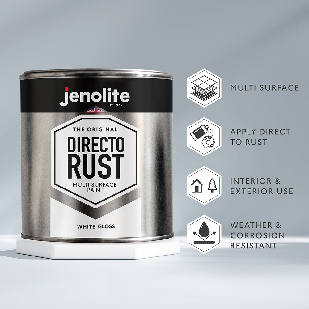 Renovate your home with beautiful Jenolite DirectoRust White Gloss Paint 1L. It is a simple and unique formula which you can apply directly to metal, wood, plastic, ceramic, and even rusted surfaces and get a new look. It saves you much time by being an all-in-one solution acting as a primer, undercoat, and topcoat. The smooth, high-quality satin finish looks great and provides excellent resistance to rust and corrosion, for a long-lasting finish. This paint is up to the task whether you're painting indoors or outdoors. It is available in a variety of colours and finishes.
