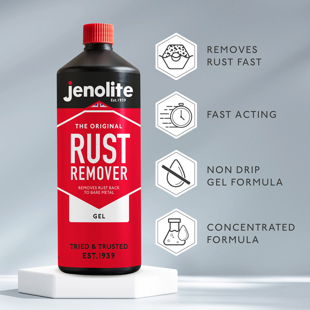 Tackle rust head-on with this Jenolite Original Rust Remover Gel. This one-litre fast-acting and powerful rust remover for metal destroys rust, taking surfaces back to bare metal. With a concentrated, non-drip formula its powerful action stays in contact with the metal surface to ensure a fast and effective rust removal. Ideal for non-flat surfaces, the gel works by chemically destroying rust into an easily removed solution that can be wiped or washed off. It is the perfect rust treatment for ferrous metal surfaces, such as cast iron and steel. Moreover, it can also be used for treating small spots on car bodywork or larger areas - safe in the knowledge that the gel will not drip or spread. Suitable for use on a wide range of rust issues, including rust treatment for car bodywork, rusty bikes, vehicle chassis, wheel arches, tools, boats, machinery, gates, garden furniture, BBQs and much more.