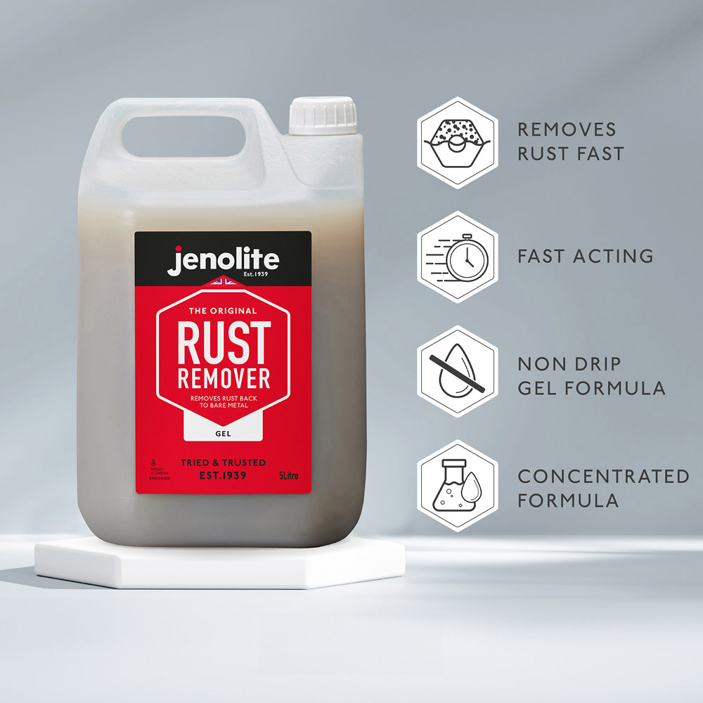 Tackle rust head-on with this Jenolite Original Rust Remover Gel. This five-litre fast-acting and powerful rust remover for metal destroys rust, taking surfaces back to bare metal. With a concentrated, non-drip formula its powerful action stays in contact with the metal surface to ensure a fast and effective rust removal. Ideal for non-flat surfaces, the gel works by chemically destroying rust into an easily removed solution that can be wiped or washed off. It is the perfect rust treatment for ferrous metal surfaces, such as cast iron and steel. Moreover, it can also be used for treating small spots on car bodywork or larger areas - safe in the knowledge that the gel will not drip or spread. Suitable for use on a wide range of rust issues, including rust treatment for car bodywork, rusty bikes, vehicle chassis, wheel arches, tools, boats, machinery, gates, garden furniture, BBQs and much more.