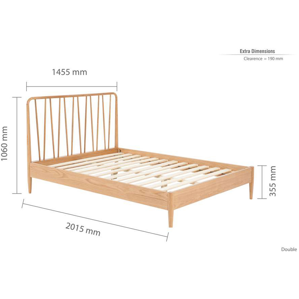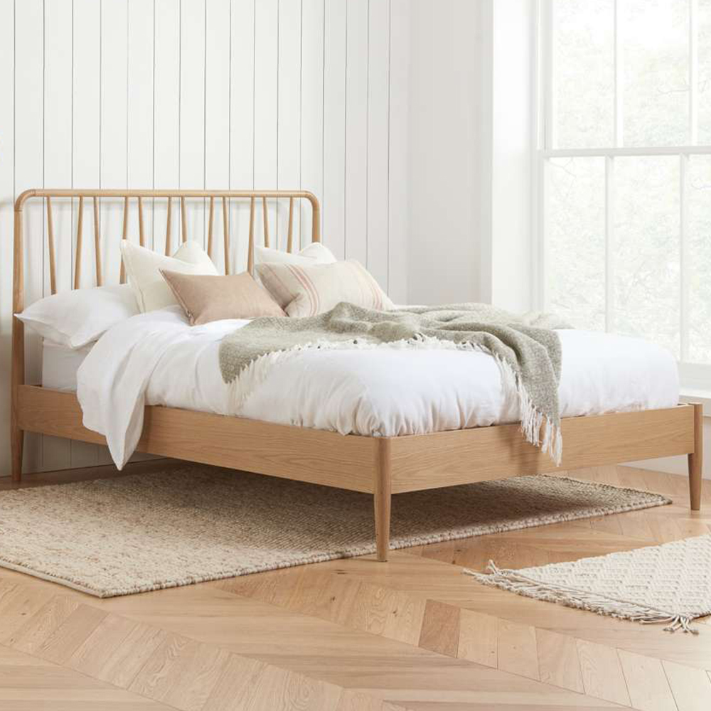 Relax in style with the Jesper Double Bed Frame. With a beautifully crafted spindled headboard giving it a real distinctive character, this classic double-size bed is crafted from oak featuring a classic construction and will look fantastic in both traditional and contemporary bedroom interiors. The frame of the bed comes with a solid slat ideal for a firmer mattress. Also, this bed frame is only suitable for a UK standard-size mattress.