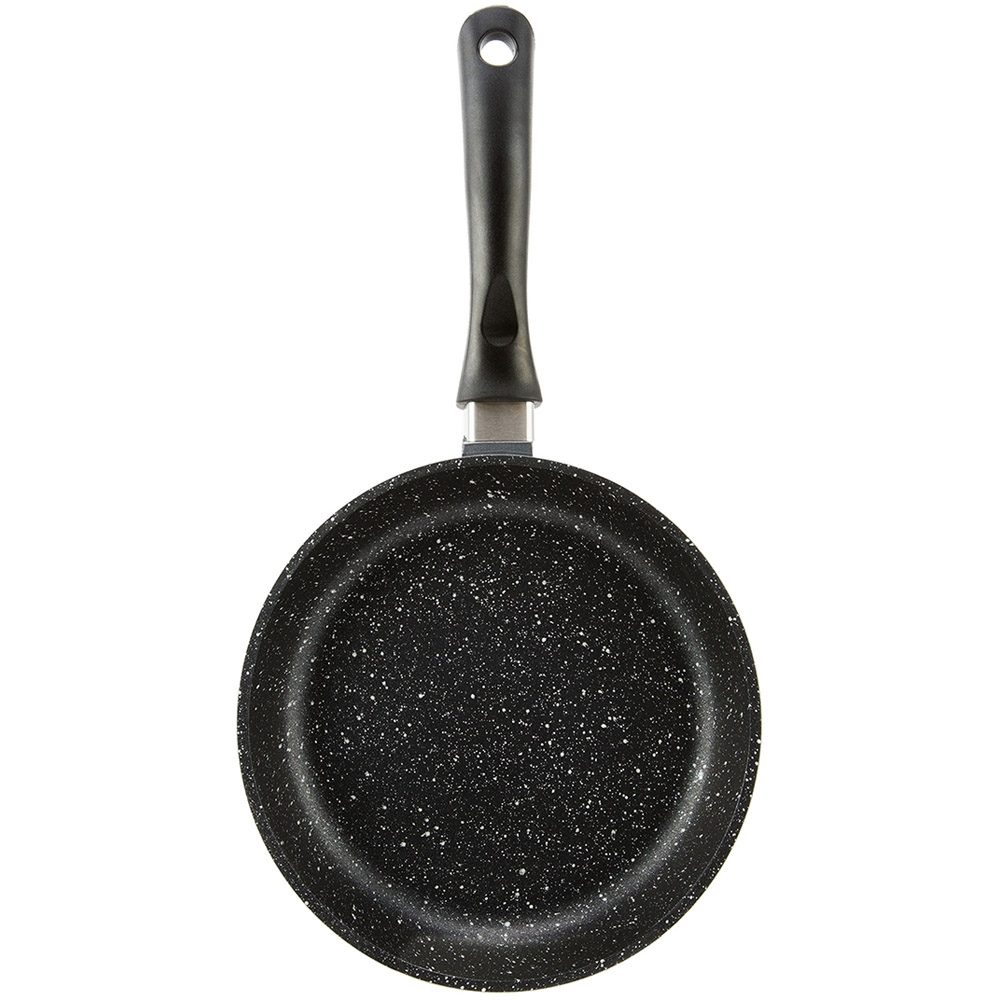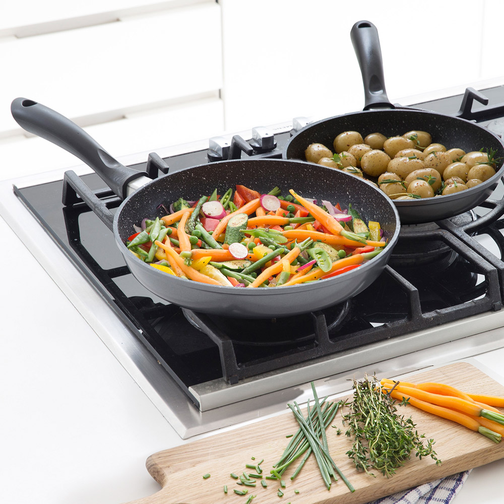 Extra strong and durable, this Regis Stone Pan from JML will make a practical addition to any kitchen. Around 24cm in size with 4mm thickness for excellent durability, this pan includes a special hybrid stone coating that allows it to absorb and conduct the heat faster, so your food cooks quicker. It features a tough anti-scratch surface with non-stick coating, so you can cook without oils or fats and clean it more easily. Complete with a step-fixed handle, the pan is suitable for use on gas, induction, electric and ceramic hobs.