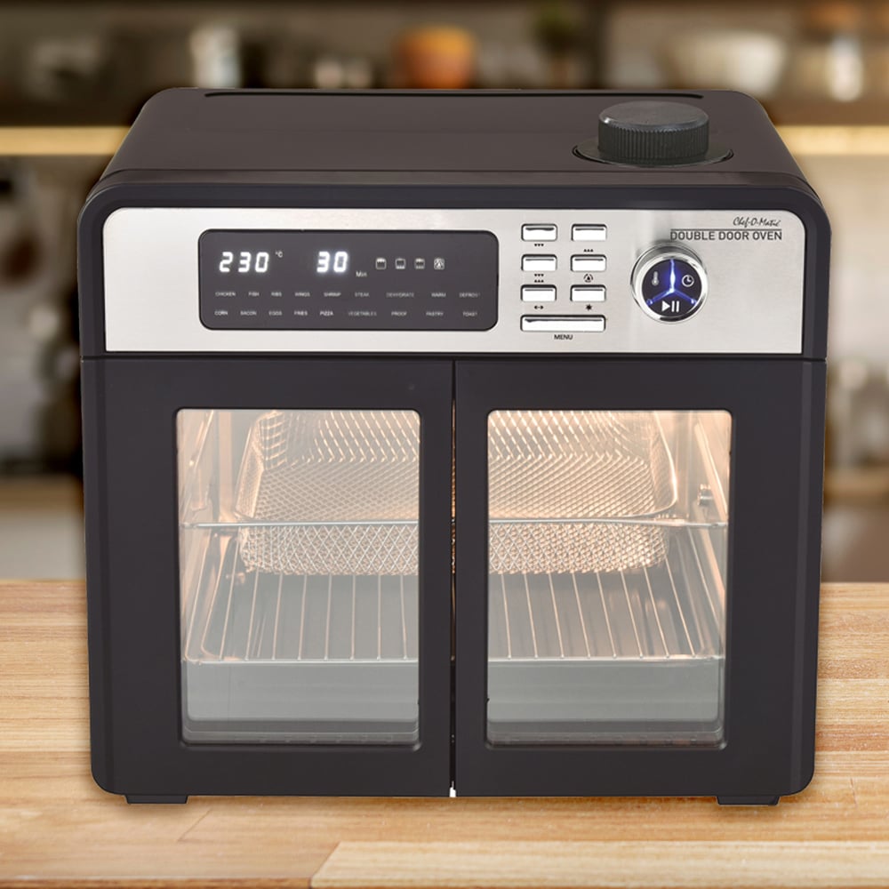 Chef-O-Matic Double Door Oven is the all-in-one worktop oven that does it all! with the power of an oven, air fryer, grill, pizza oven, rotating rotisserie, food dehydrator, and more right on your countertop, you're not just cooking – you're transforming how you cook. It's designed to simplify meal prep, cut down on cooking time, and deliver delicious, perfectly cooked meals every time. Just set it on your counter, choose from one of its 18 preset cooking programs, and watch as it makes everything from crispy fries to rotisserie chicken in a fraction of the time! Discover the Chef-O-Matic Double Door Oven and revolutionize your kitchen with the ultimate, multifunctional cooking appliance that does it all!