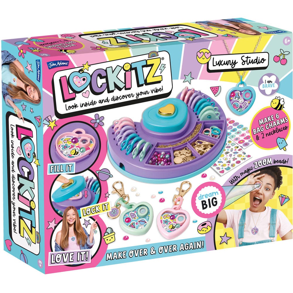 Make and create eight amazing Lockitz to match your vibe with the John Adams Lockitz Luxury Studio Play Set. Look through the magic zoom bead to find a bright and colourful positive vibe waiting inside, just for you. Mix and match super-cute decorations to create your personalised accessories, then wear and share your Lockitz. There are so many colours and combinations to explore. It includes six beautiful bag charms and two necklaces that can be made over and over again. Contents are neatly stored and stacked inside the handy Lockitz Luxury Studio. Suitable for children aged six years and above.