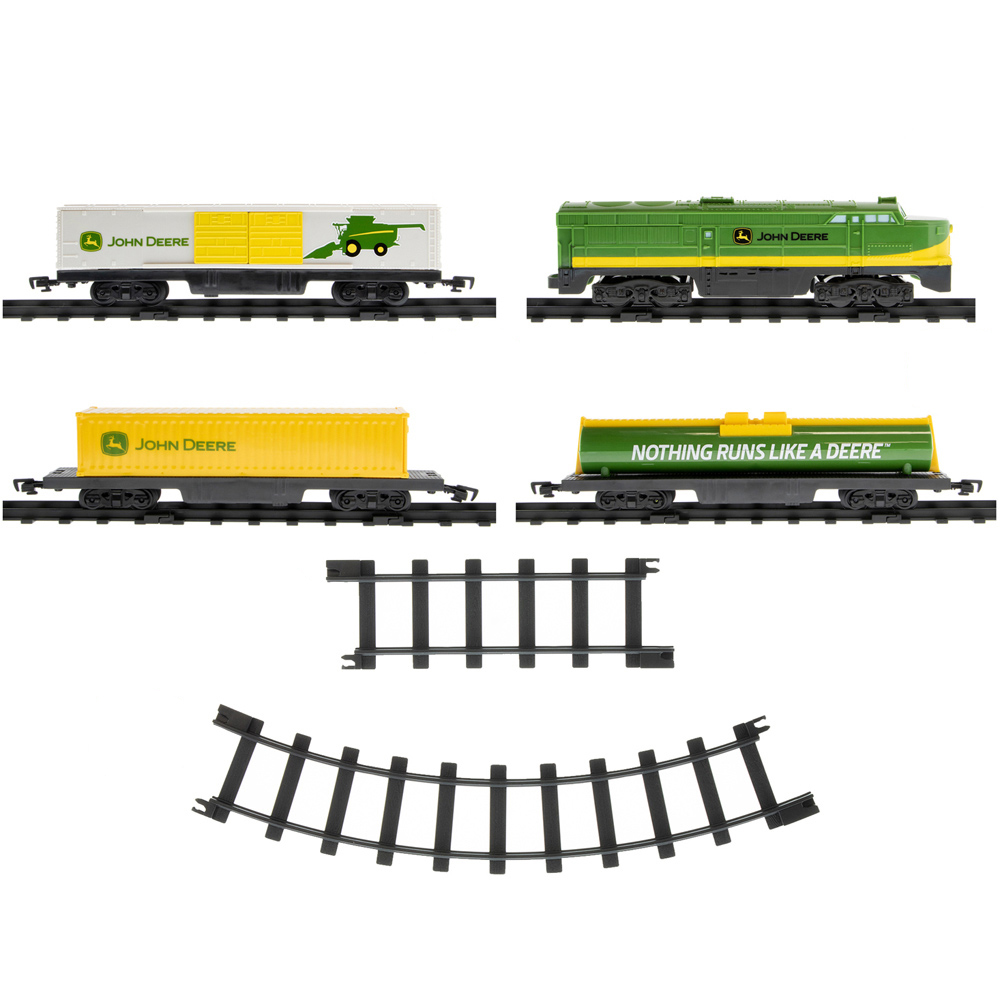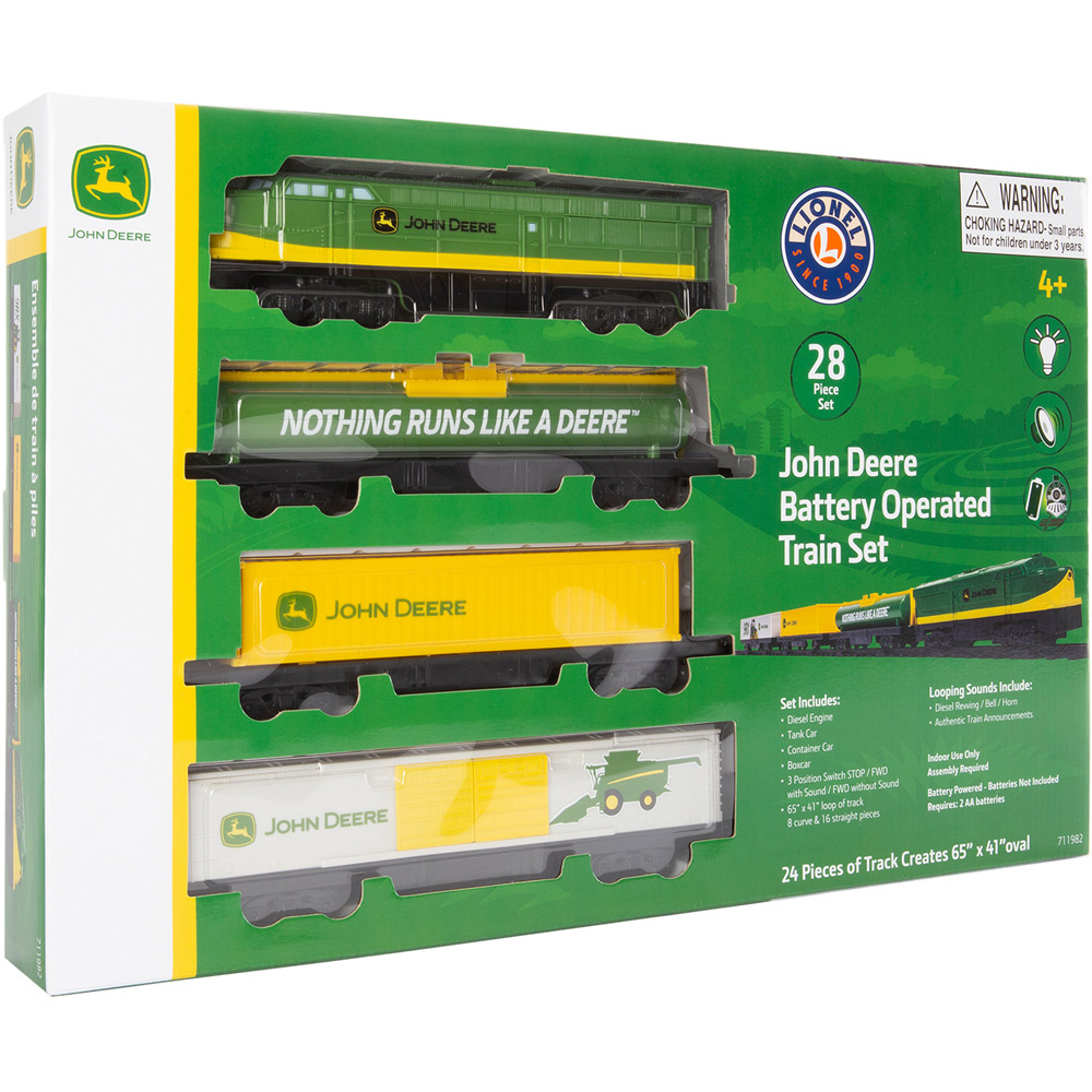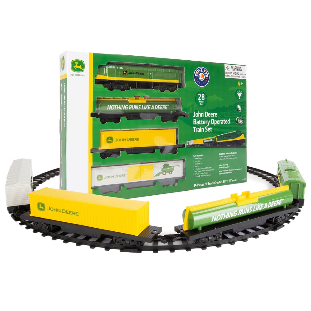 Connect the world of trains and farming with the captivating Robbie Toys 28 Piece John Deere Express Train. This battery-operated train set, licensed by John Deere, allows you to teach your little farmer about transporting equipment to help the land grow. With a 24-piece track consisting of eight curved plastic track pieces, 16 straight track pieces and a four-piece train, this set guarantees hours of agricultural adventure. The John Deere Express Train features a realistically styled John Deere diesel locomotive engine, a John Deere tanker carriage, a John Deere container carriage, and a John Deere boxcar, forming an 81cm long and 7cm tall train when connected. Experience the excitement as the engine showcases a working headlight and emits captivating sounds, including the diesel engine revving, a bell, and a horn. The engine also features a three-position switch for easy control. Immerse yourself in the world of farming as you listen to two captivating announcements, including Dispatcher here, you're clear outbound, over; Thanks boss, out, and Keep 'em rolling, dispatcher over; Understood! out. Once assembled, the track forms a charming 1.6 x 1m oval, allowing you to create a delightful display for the festive season. This John Deere licensed train set is suitable for indoor use and is suitable for ages four and above. To bring the train to life, it requires 2 x AA batteries (not supplied).