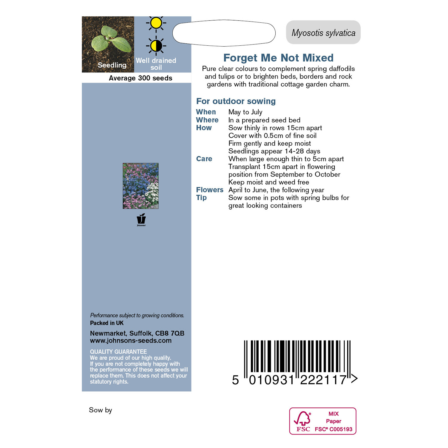 Compliment spring daffodils and brighten beds, borders or rock gardens with this packet of Forget Me Not Mixed Seeds. Offering an array of pure, clear colours in classic blues, sweet pinks, and clean whites, Forget Me Nots will always bring a soft touch to any garden.
