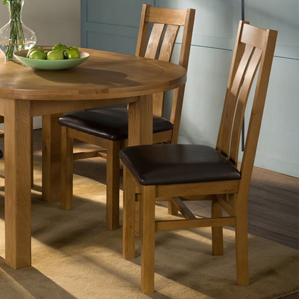 Crafted from waxed oak and upholstery with rich, chocolate toned faux leather, our Pair Of Kinsale Arch Back Dining Chairs masterfully blends comfort and beauty. Cushioned seats offer padding when sat, whilst the contemporary high backs feature a classic oak slat design and offer improved lumbar support. Pairing exquisitely with the Kinsale Extending Dining Table from our exclusive Jonas & James collection, these chairs bring warmth and style to meal time.