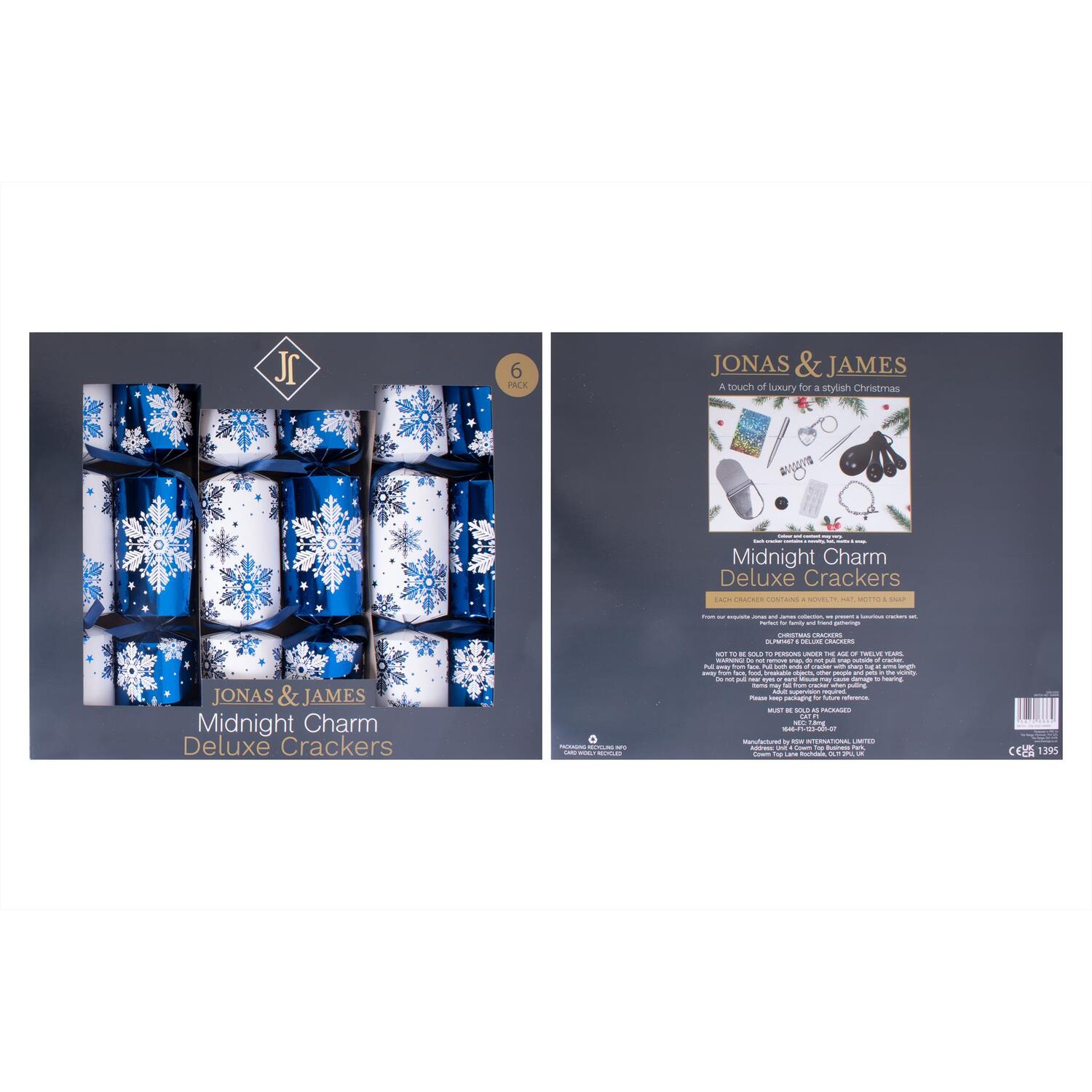 Adorn your table with this stunning Pack of Six Midnight Charm Deluxe Crackers this Christmas. Perfect for enjoying with family and friends, each cracker contains a novelty, a hat, a motto and a snap. These 13.4-inch crackers have a festive blue and white snowflake design, finished with a stunning midnight blue ribbon.