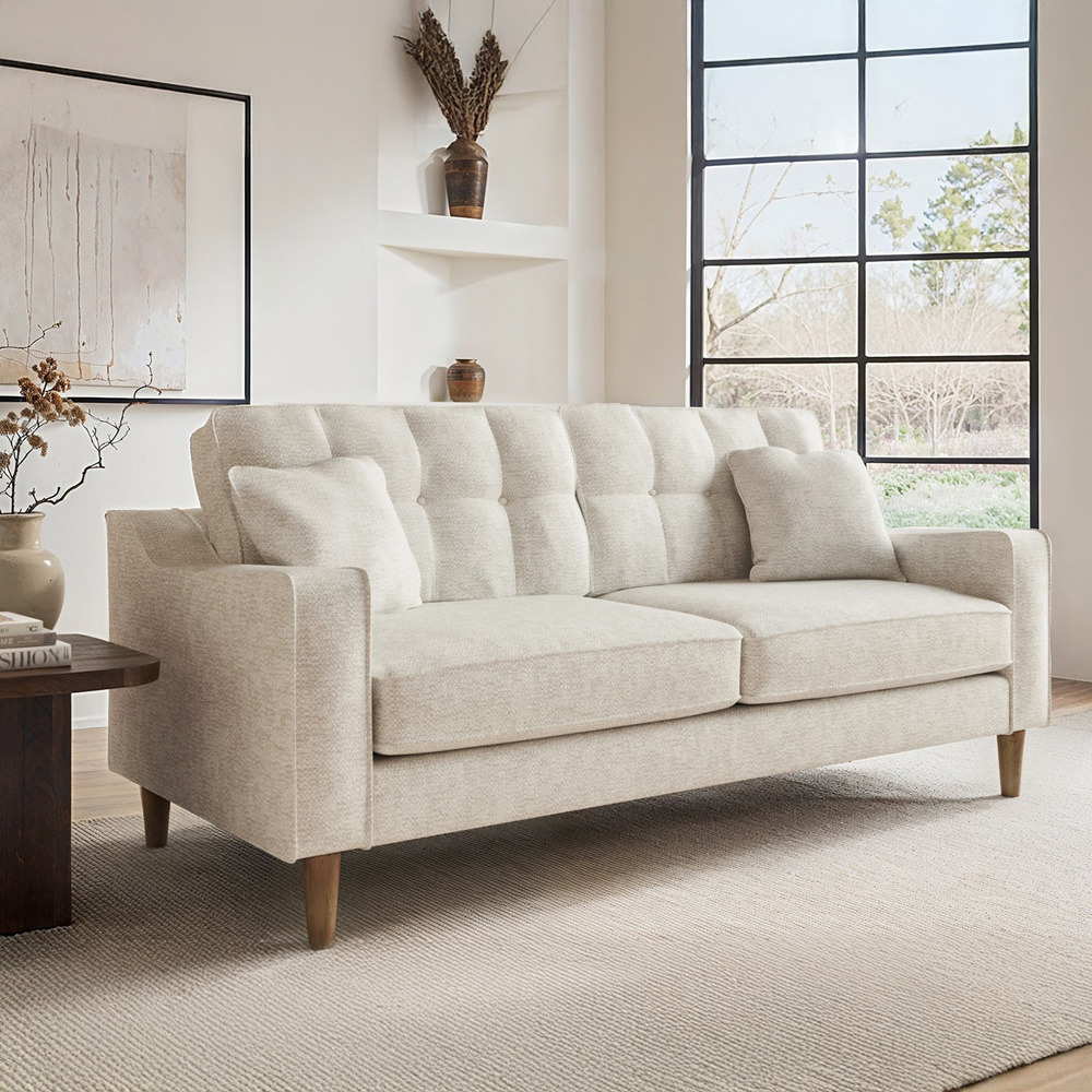 Experience the perfect blend of luxury and comfort with Solace+Co Jude 3 Seater Beige Mid Century Fabric Sofa. It is a stylish blend of retro aesthetics and contemporary comfort, making it a perfect centrepiece for any living room. Embracing a mid-century design, this sofa features elegant button detailing on the back cushions and sides, giving it a timeless appeal that’s both sophisticated and inviting. Upholstered in soft beige fabric, this sofa is versatile enough to complement a variety of interior styles, while its foam-filled seat and back cushions provide exceptional comfort and support. The sofa comes complete with scatter cushions, adding an extra layer of luxury and enhancing its cosy, inviting feel. Setting up this sofa is effortless, you simply have to attach the feet, and it’s ready to elevate your space. With its compact yet spacious design, it offers ample seating for three, making it ideal for family rooms, living spaces, or even office settings.