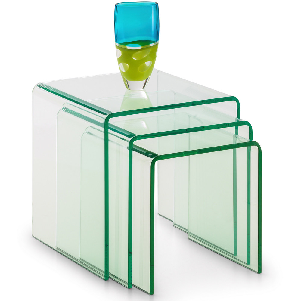 This Amalfi bent glass nest of tables is exquisitely crafted using a single sheet of tempered glass. This nest of glass tables is bent and moulded into a curvaceous design without any joins or fixings. This delicate yet classy nest of tables will surely complement all types of interior spaces. These clear-glass tables create the feeling of more space in your home while adding a touch of elegance.