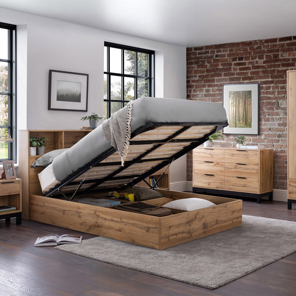 Add a bit of rustic charm to your living space with the Julian Bowen Bali Double Light Oak Wooden Storage Ottoman Bed. Crafted with the look and feel of natural oak, this beautiful bed complements just about any bedroom interior. The oak finish adds a calming neutral element to any bedroom, making it a great addition to any decor style. The Ottoman-style design provides ample storage space without compromising on style and quality. One of the unique features of this piece is its headboard, which comes with a storage space for books. The bookcase doesn't just look beautiful, it also enhances the productivity of your sleeping space. The innovative Click Furniture technology allows for easy assembly, making this bed a convenient and hassle-free option.