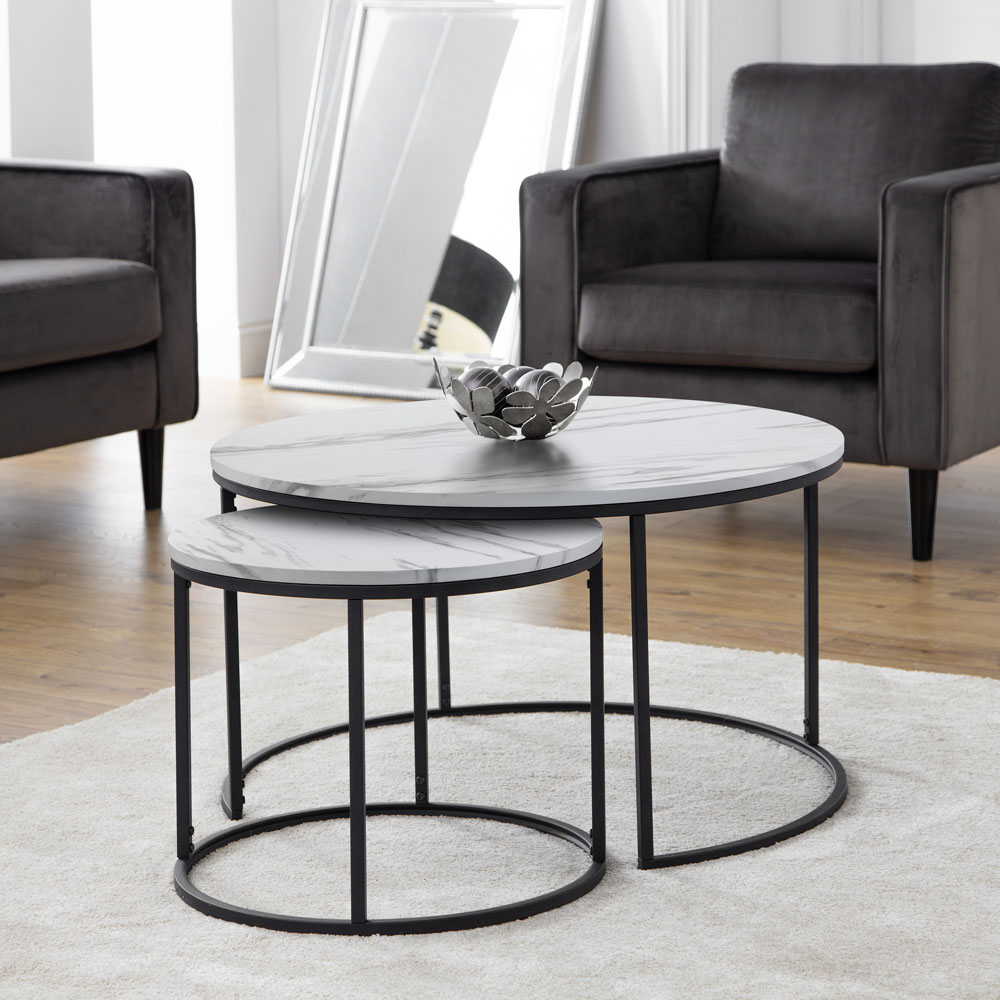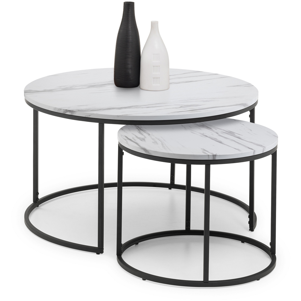 Elevate your living space with the Julian Bowen Bellini White Marble Round Nest of Tables Set of 2. This coffee table is crafted from black-coated metal and MDF in a white marble foil finish to ensure long-lasting durability. This set includes a round coffee table and a matching nesting table featuring a contemporary and stylish design with an industrial feel complemented by strong and durable construction. With its black metal legs, this modern design is suitable for any type of decor.