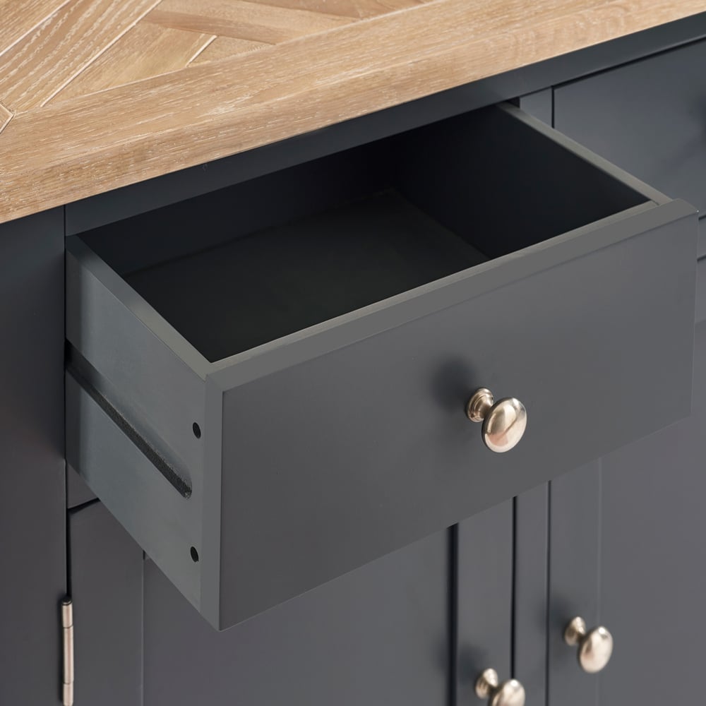 Make a classic addition to your home with the Julian Bowen Bordeaux Sideboard. This range offers an authentic design that is stylish and practical as well. This sideboard comes in a soothing dark grey finish, ideal for most interior spaces. It features a three-drawer and three-door design with a contrasting top, which is ideal for all your essentials. This exquisite sideboard will certainly make your house feel like a home as it offers timeless elegance, enriching your home decor.