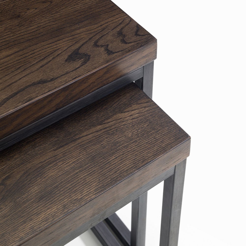 Bring warmth and character to your home with the Julian Bowen Brooklyn Dark Oak Nest of Tables Set of 2. Made from solid oak, these tables ehibit a rustic dark oak finish, emphasising the stunning natural wood grain. The tables offer a vintage edge featuring industrial-style metal legs. Stylish, functional and well proportioned, these lamp tables are a perfect space saving solution suitable for a wide range of modern decor.