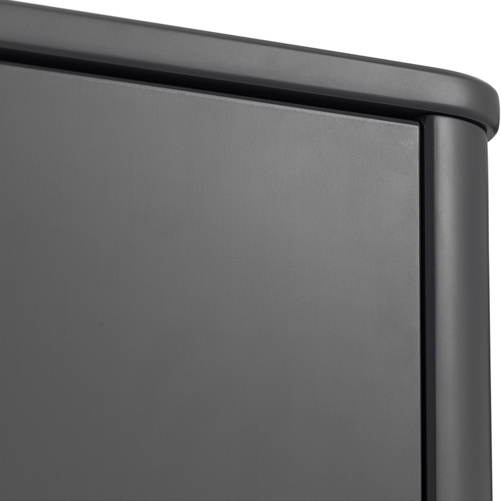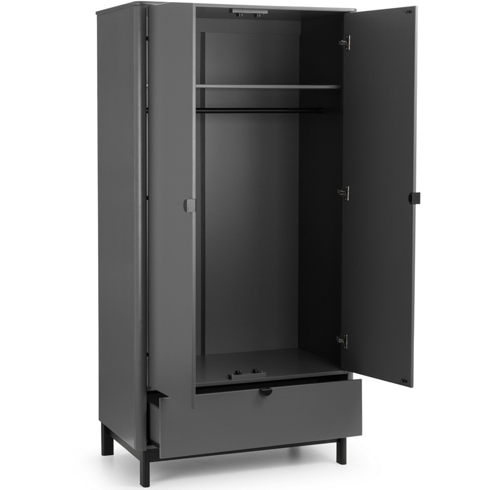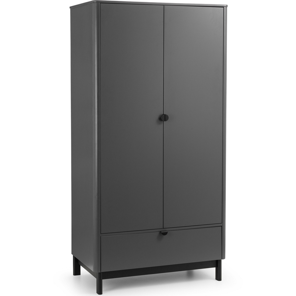 Keep your space clutter-free with this Julian Bowen Chloe 2-door Single Drawer Storm Grey Wardrobe. This wardrobe has a modern, retro style finished in a storm grey lacquer with satin black wooden legs and handles. Also, the corners are rounded for a softer look, creating a perfect balance between style and functionality. Plus, the wardrobe comes with a large hanging area behind two doors, along with a drawer for additional storage.