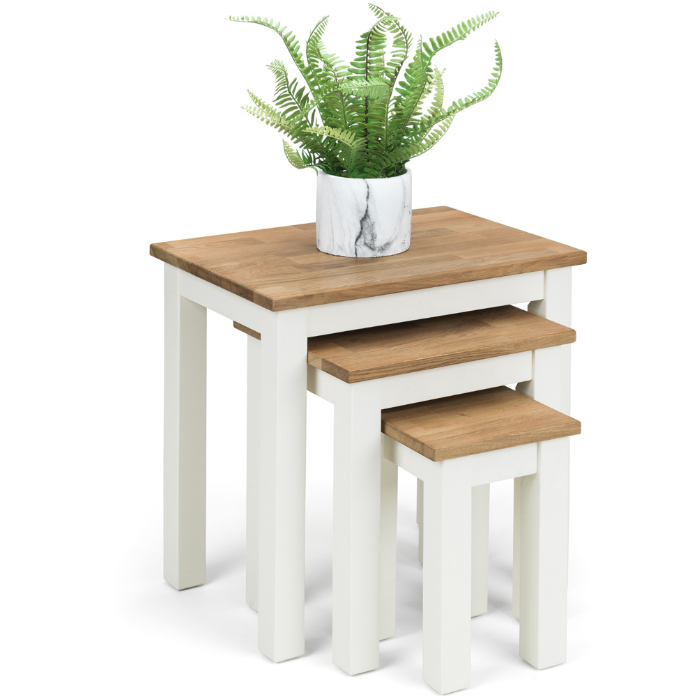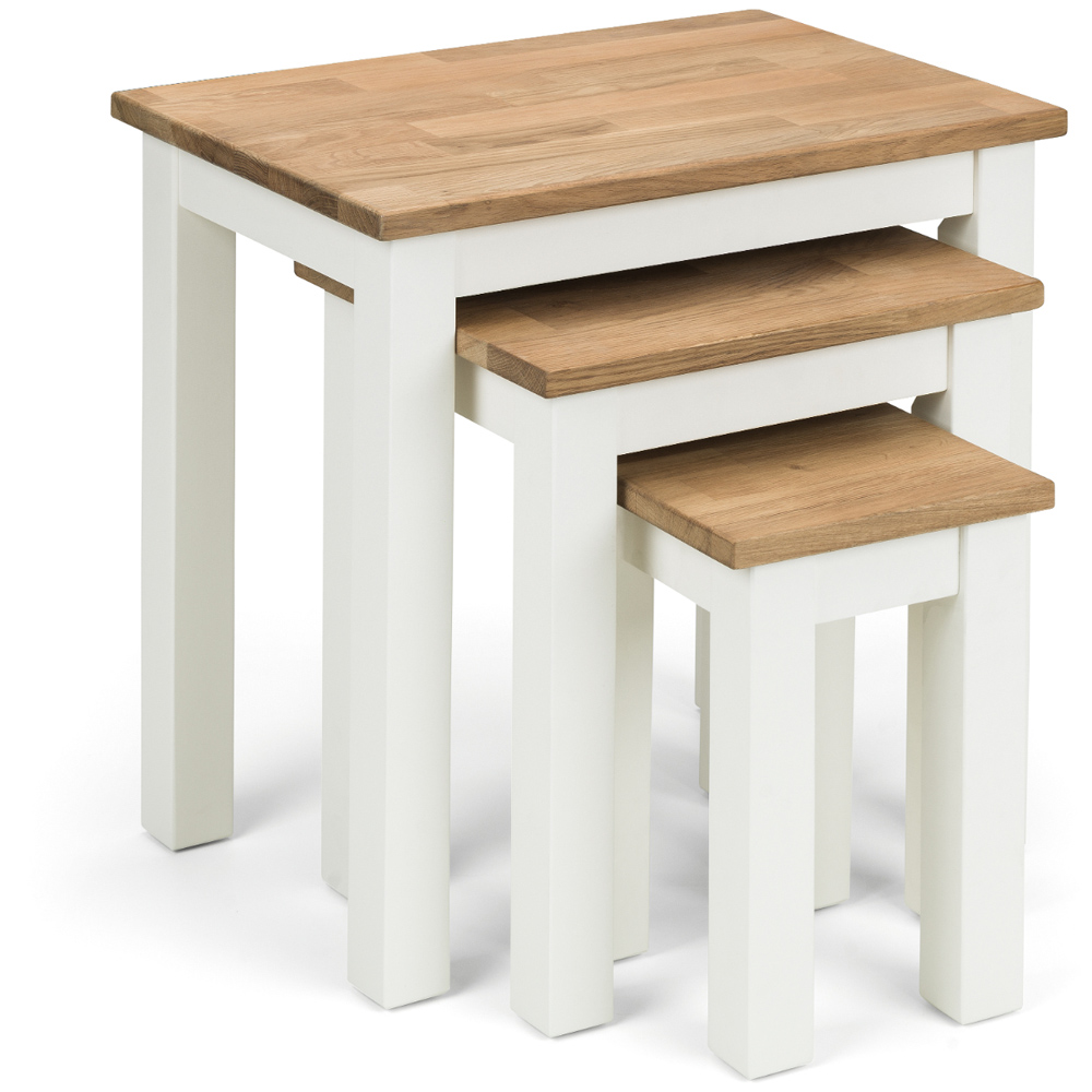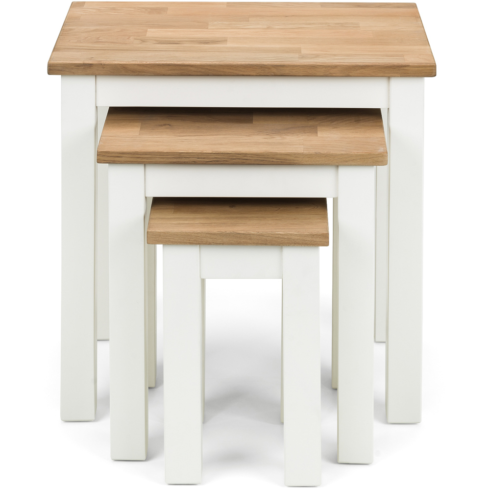 Add convenience and charm to your space effortlessly with this Julian Bowen Coxmoor Ivory and Oak Nest of 3 Tables. Crafted from solid white oak and finished with rich oil, giving a warm, sophisticated finish to create a stunning look that complements a broad range of decorative styles. Immaculately finished range of dining and occasional furniture, the nest comprises three tables for superb versatility and is stylish, functional and well-proportioned.