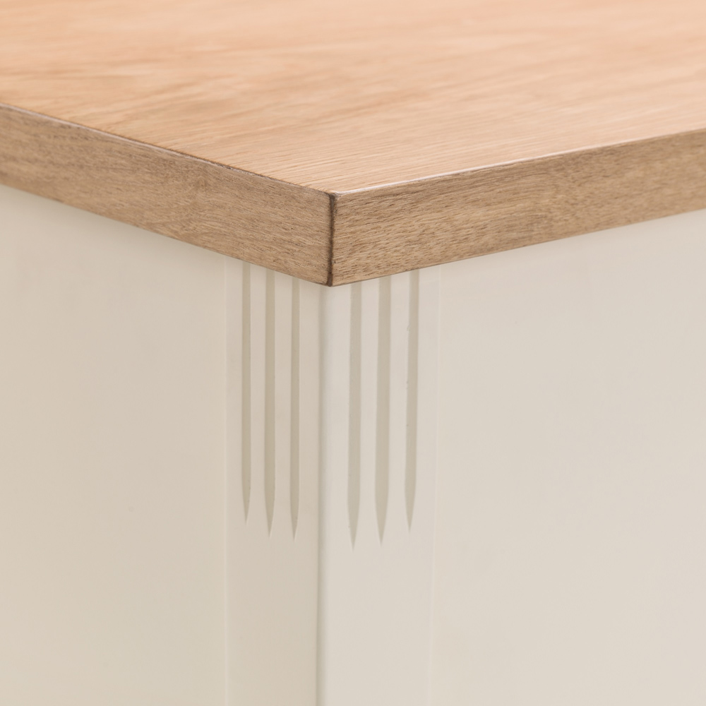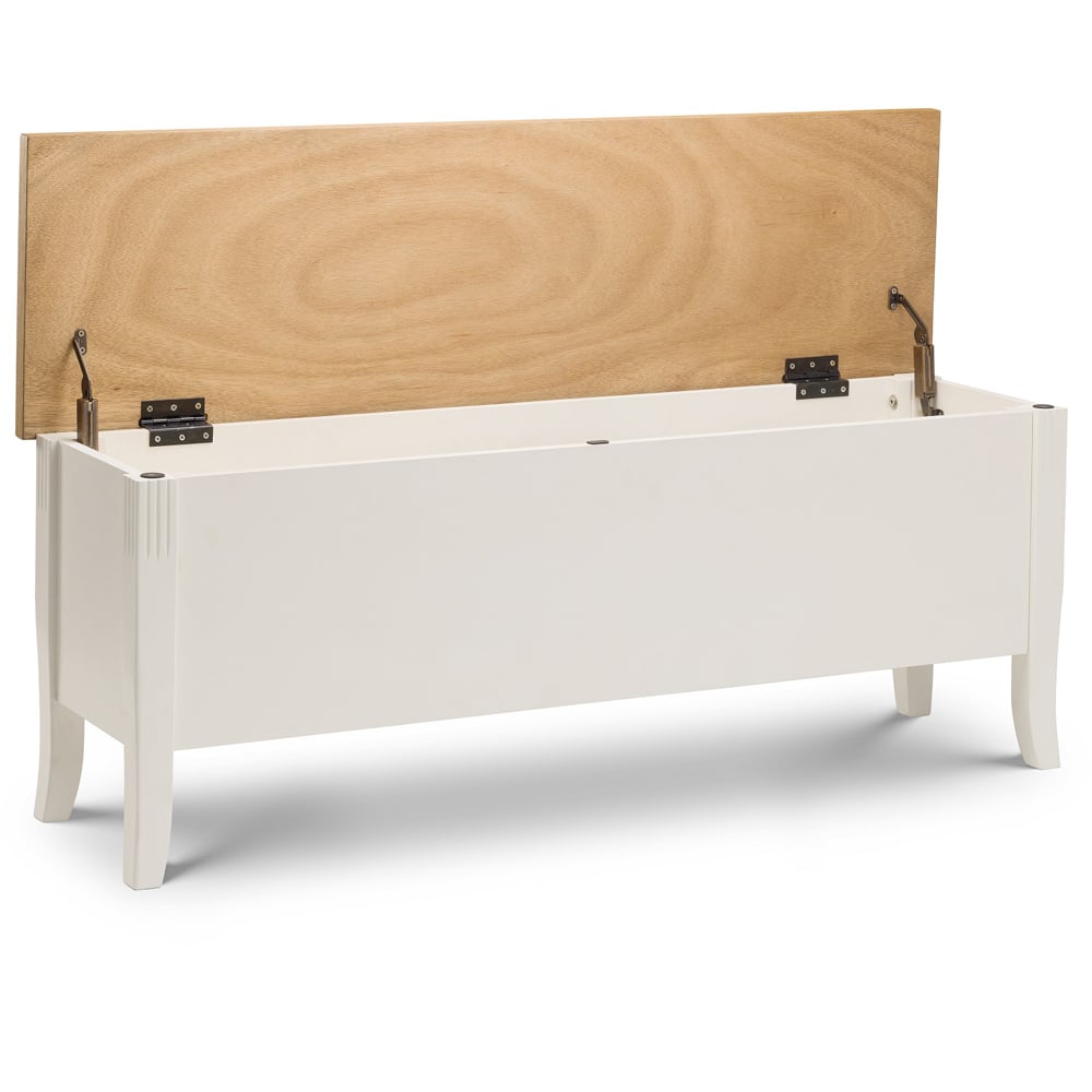 Experience comfort and versatility redefined with this Julian Bowen Davenport 2 Seater Oak and Ivory Storage Dining Bench. This stylish and functional addition invites relaxation, fostering a welcoming ambience while effortlessly blending into any modern design. Crafted from solid rubberwood and a real oak veneer top, this bench is perfect for additional storage, seating or both. An elegant ivory finish adds a touch of elegance to any hallway or dining area.
