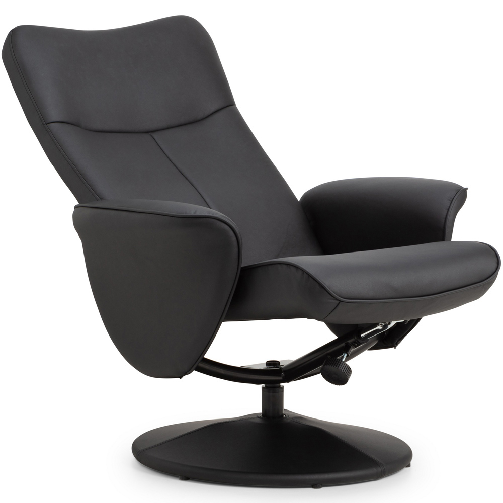 The Julian Bowen Lugano Black Faux Leather Recliner Chair with Footrest offers a sleek and contemporary design. It features a black faux leather finish and a covered base. It is an ideal addition to any modern home, providing both style and functionality. This chair not only reclines but also swivels, allowing you to effortlessly find your desired position. With its simple yet elegant design, it is a perfect choice for those seeking comfort and practicality.