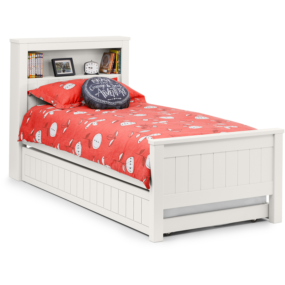 Uplift your bedroom decor with this Julian Bowen Maine Surf White Bookcase Bed with Underbed. The Maine Bookcase Bed features a high headboard with a shelf, perfect for storing books within arm's reach for your evening read. Crafted from MDF with exquisite lacquer, this bed features New England-style panelling on the headboard, creating a timeless appeal. Its strong and durable construction with a solid slatted base ensures supreme comfort and prolonged mattress life. It also has an under-bed, which creates a space-saving solution and is a perfect choice for sleepovers.